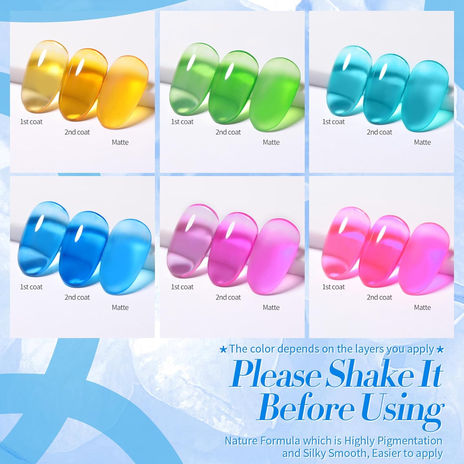 - PACKAGE CONTENTS:6 Bottles BORN PRETTY Neon ice jelly gel nail polish set.Jelly gel nail polish is a popular nail trend that gives your nails a glassy, see through appearance effect similar to jelly.The jelly nail polish color different from ordinary gel nail polish.It is a ice jelly nail gel. 1 layer, 2 layers and 3 layers are different effect.
