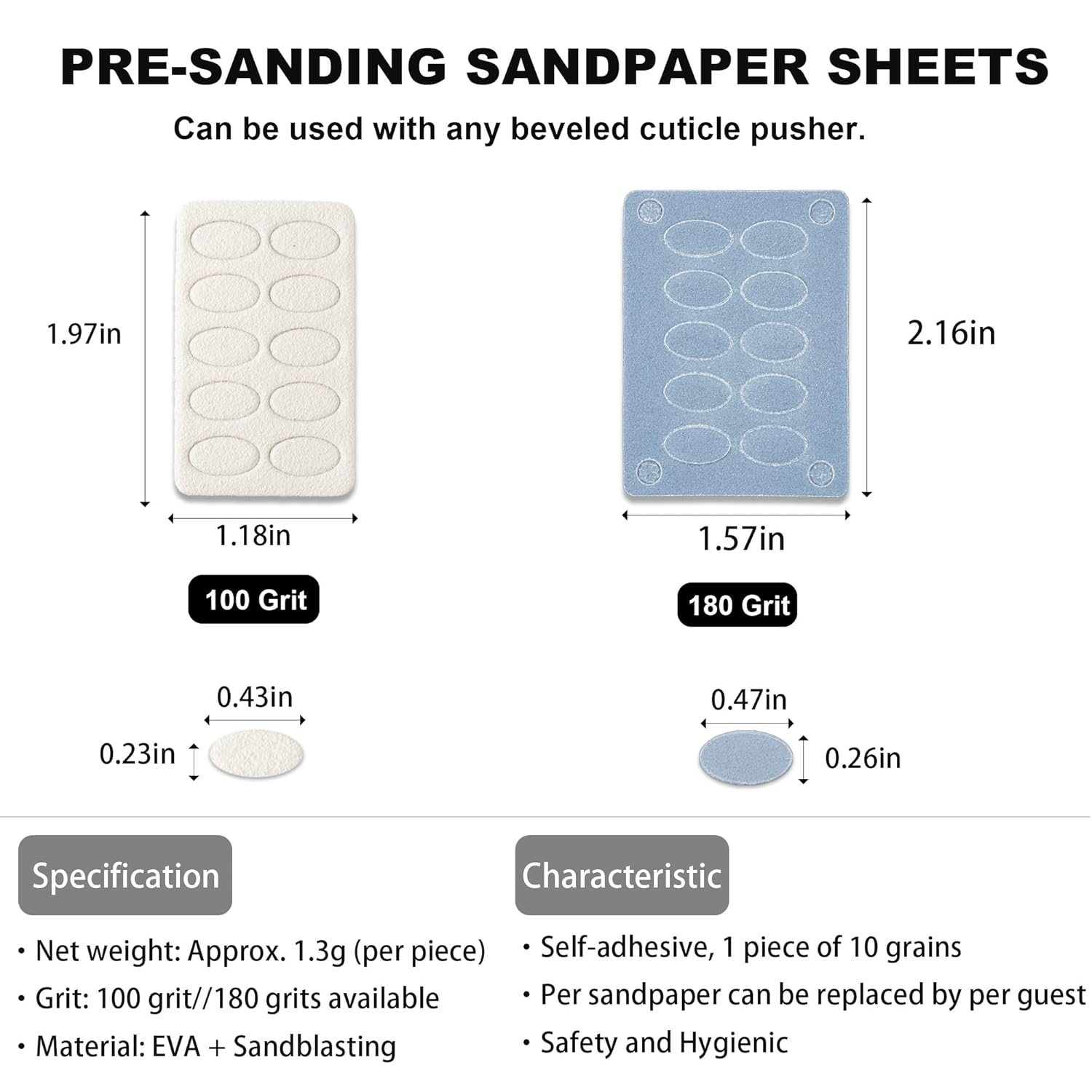 Pre-treatment Cuticle Pusher, Russian Prep Nail Pushers, Dual Ended Cuticle Remover with 100/180 Grit Sandpaper Sheets, Nail Care for Manicure Pedicure Nail Art