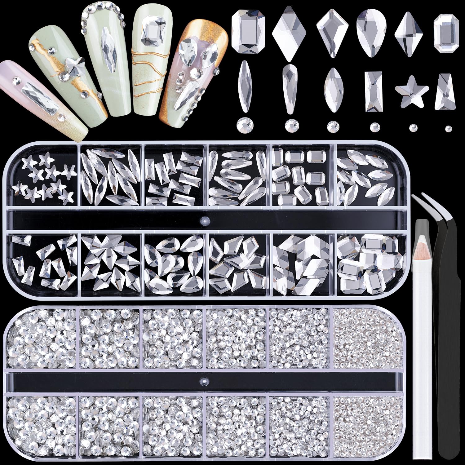 - ๐PACKAGE CONTENT -- The package contains 120Pcs multi shapes flatback gems crystal and 3100Pcs 1.5-4mm round beads, totally 3220Pcs Clear rhinestones. Additionally, 1 tweezers for large size gems and 1 pickup pen for small size gems. This rhinestones kit makes it easy for you to make any nail art you like, and will bedazzle your acrylic nails!