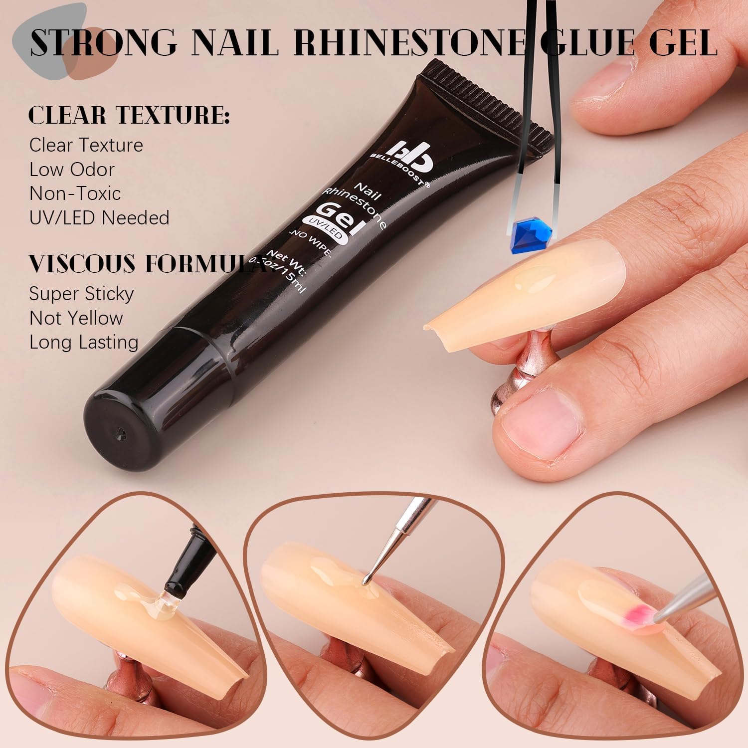 - ๐ADHESIVE GEL GLUE: The rhinestones glue gel uses a special, non-toxic and eco-friendly formula with strong tackiness, adhesion, and fluidity for easily applying decorations. It is a type of UV gel glue. After proper curing under a UV/LED lamp, the glue dries clear with superior bonding strength that can last a few weeks without falling off. With the designed tip, you can easily and conveniently apply the glue to the nail bed or the surface of false nails.