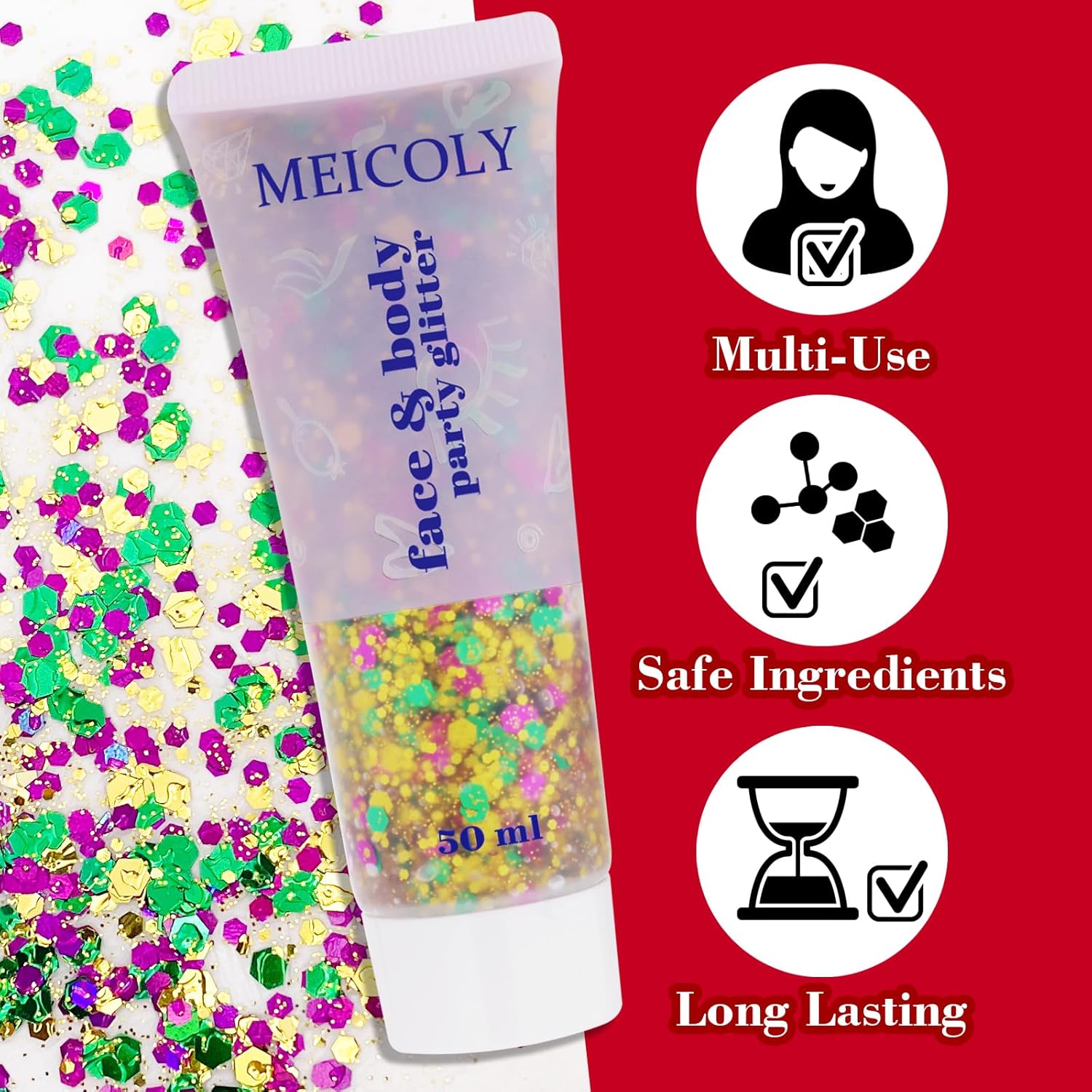 - ๐๐๐Mardi Gras Face Glitter:MEICOLY Mardi Gras glitter gel is mixed with green face glitter,gold face glitter and purple face glitter in a tube.With large number of holographic sequins, the color and shine of the laser sequins vary with the perspective,great for festival rave accessories outfit,perfect glitter for Mardi Gras Carnival