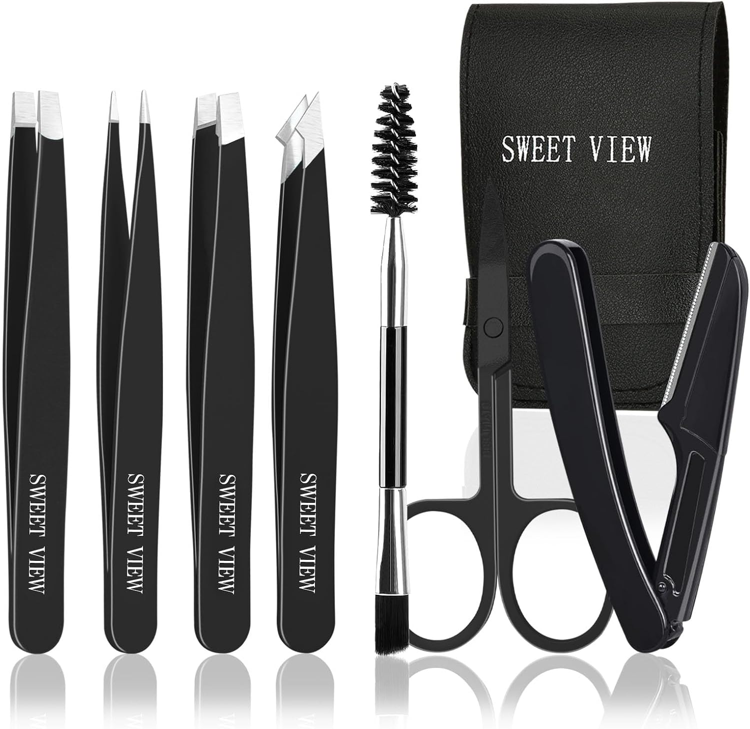 7pcs Eyebrow Tweezers Kit for Women Precision Plucker with Brow Scissors & Razor & Spoolie for Facial, Chin, Brow, Splinter and Ingrown Hair