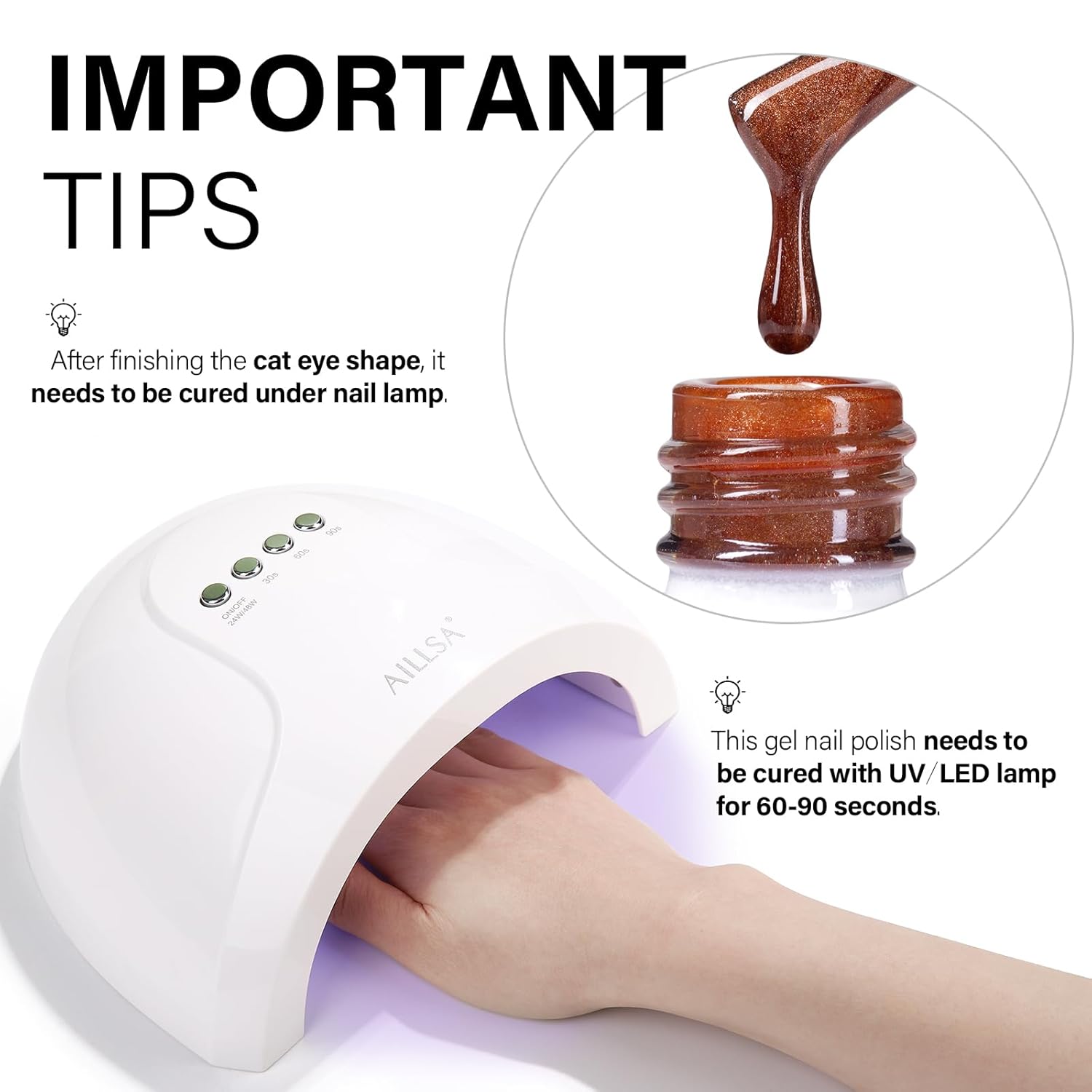 - LONG LASTING SHINE - AILLSA amber gel polish needs to be cured under U V lamps, and with the right application procedure, it can last 21-28 days to maintain the glittery shine. You no longer have to worry about your nails peeling off in the shower or while doing chores.