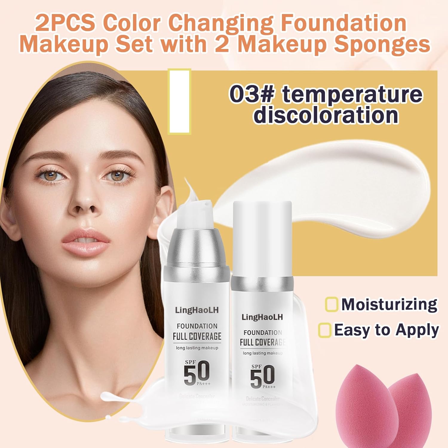 2PCS Color Changing Foundation Makeup Set with 2 Makeup Sponges,Moisturizing Full Coverage Liquid Foundation for Women,Non-greasy Long Lasting Flawless Concealer Cream Makeup Foundation Set