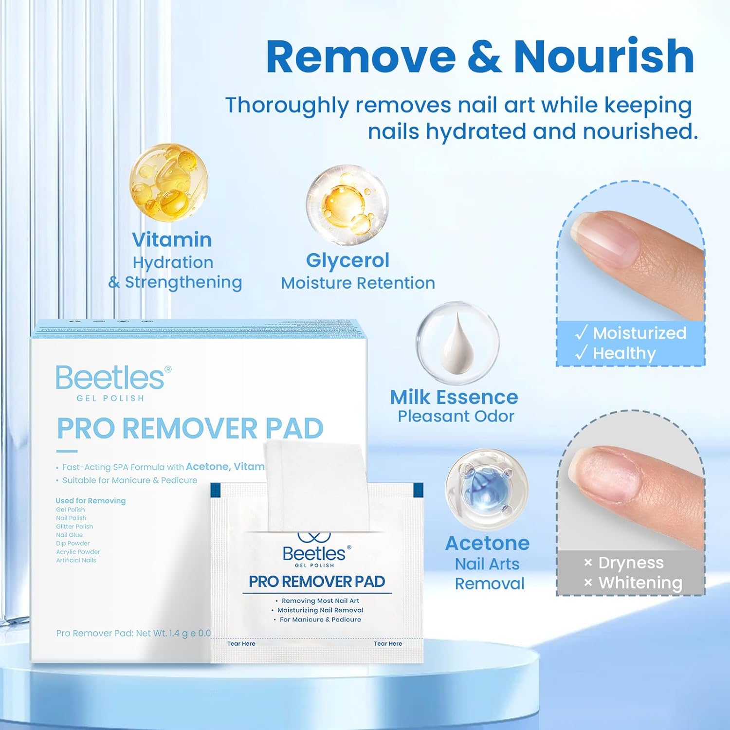 - 3-in-1 Nourishing Formula: Our Pro Remover Pads are infused with a powerful yet gentle blend of acetone, moisturizing glycerin, and nail-loving vitamins. Quickly removes polish while leaving nails smooth, hydrated, and healthy.