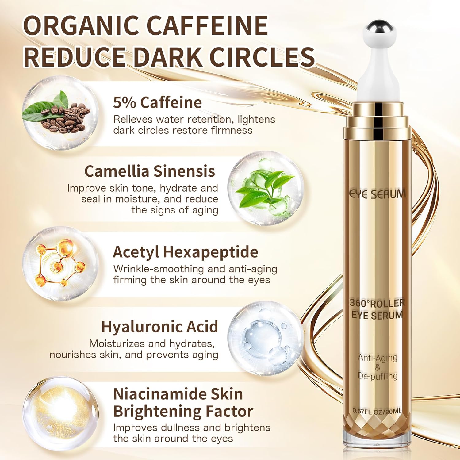 Caffeine Eye Serum, 0.67 Fl. Oz. Under Eye Cream for Dark Circles and Puffiness Eye Care Eye Serum Anti Aging with 360° Massage Ball Reduce Eye Bags, Wrinkles and Fine Lines