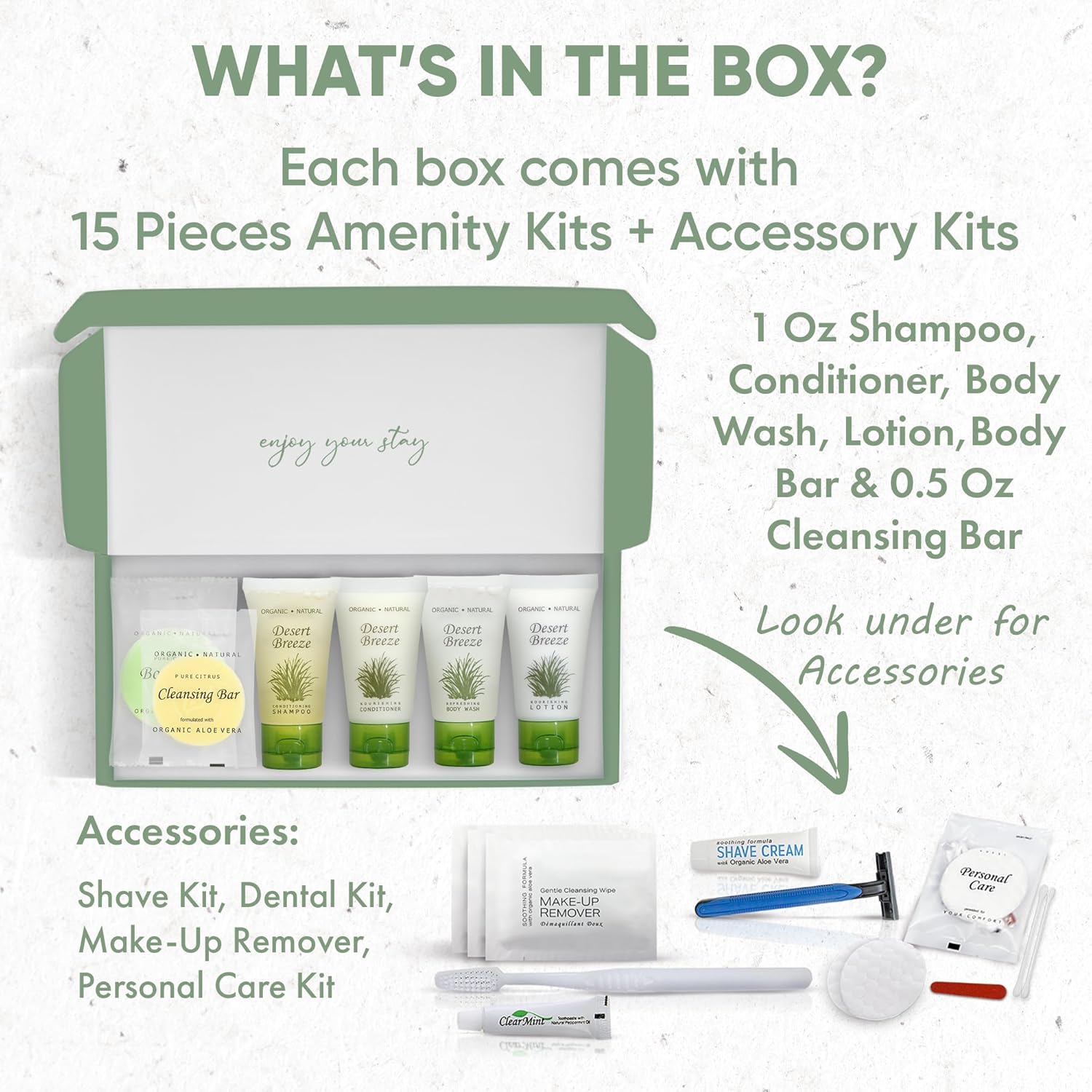 Desert Breeze Amenity & Accessory Kit | 1 oz Travel Size Shampoo, Conditioner, Lotion, Body Wash, Body Bar, Cleansing Bar, Shave & Dental Sets, Make-Up Remover Wipes, & Vanity Kit | 15 sets per case