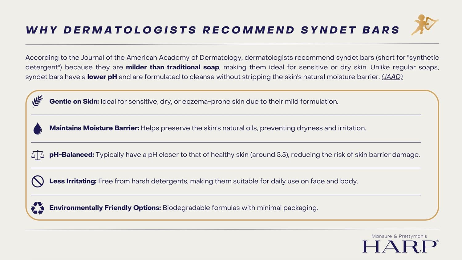 - โ pH-Balanced 5.0-6.0 to match and retain the skin's natural moisture barrier. Completely saponified vegetable oil free so it wont dry your skin. HARP products are not blends either, we do 100% syndet bars. Theres nothing better or more gentle on the market.