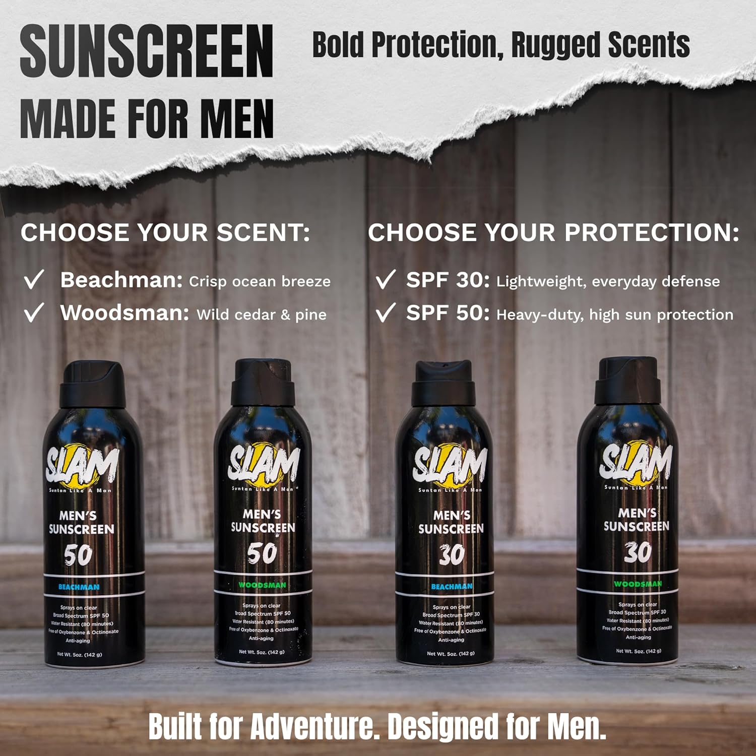SLAM WoodsMan Men's Scented Sunscreen Spray SPF 30 – Broad Spectrum Sun Screen Spray for Face & Body, Water Resistant & Sweat Resistant Sunscreen, UVA/UVB Protection, Sunblock for Men