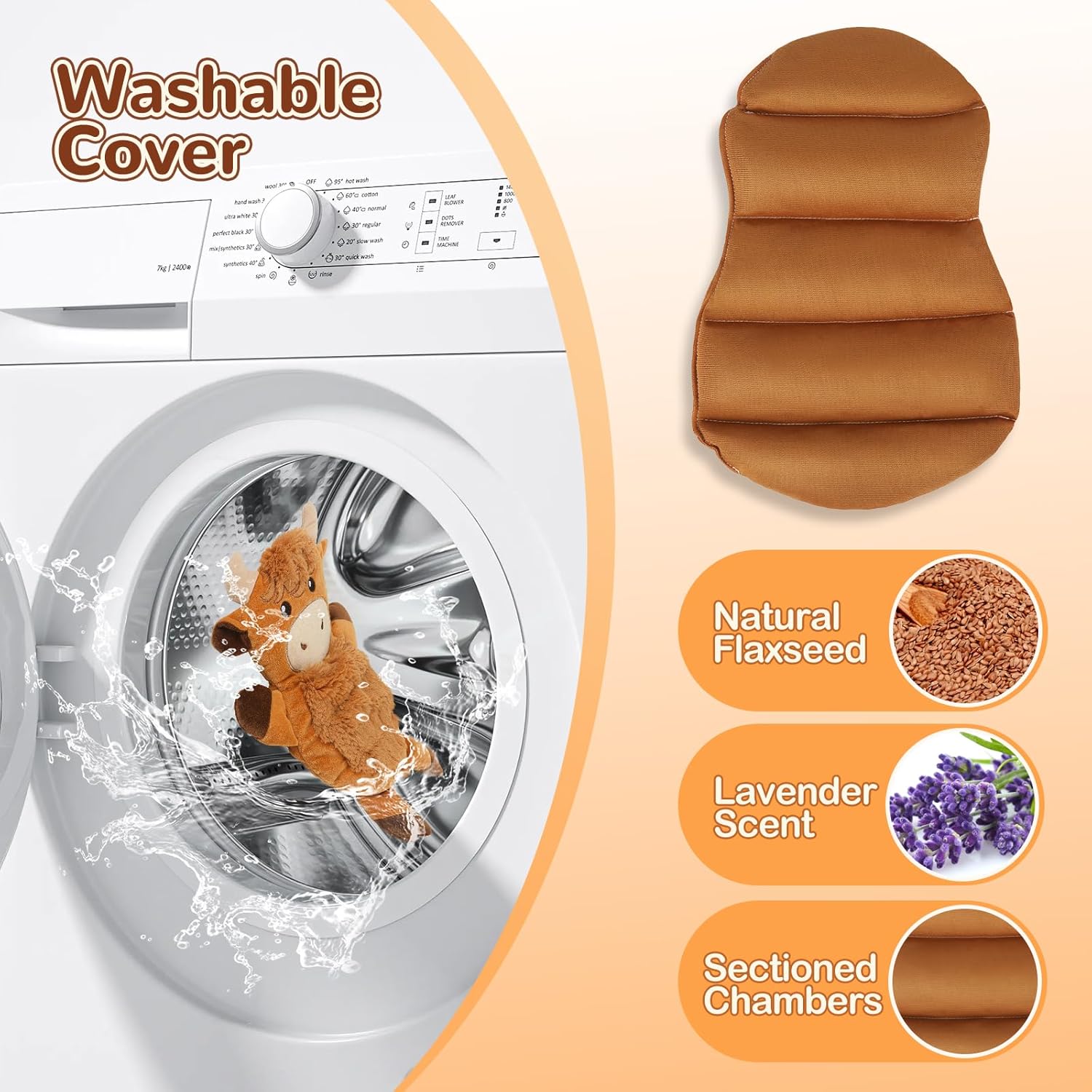 - Natural Filling & Safe Use: The lovable 16" x 11" Highland Cow Cora cover comes with removable insert which is filled with flaxseed, releasing comfortable moist warmth and penetrating to your painful area. Lavender lend a floral and fresh fragrance to calm you, soothe you as well as relieve your headache and improve sleep. The cordless design are much safer and more convenient, and it could be freely taken to anywhere.