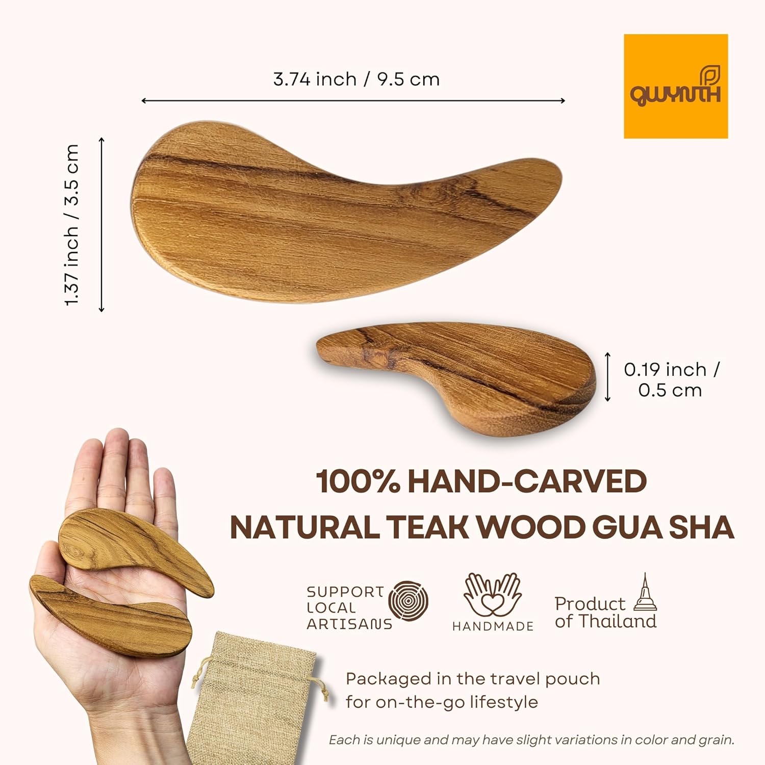- ๐ณDISCOVER THE MAGIC OF TEAK WOOD GUA SHA! Made from 100% premium golden-brown teak wood. This anti-static, lightweight Gua Sha tool is durable and crack-resistant. Each piece is handcrafted by skilled Thai artisans and showcases unique teak grain. Finished with olive oil, it offers healing benefitsโreducing stress, restoring your nervous system, and promoting calm.