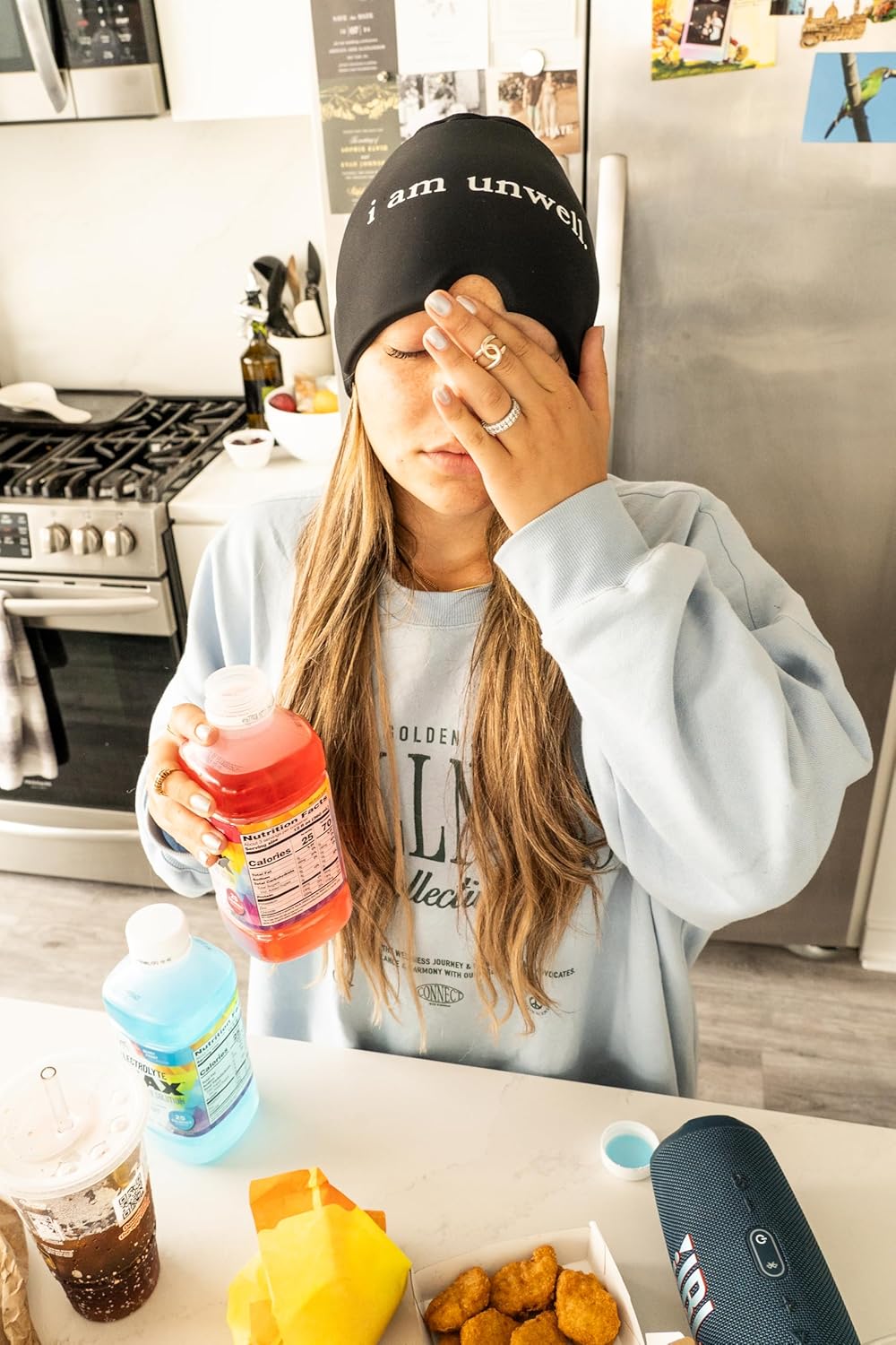 Huggs Migraine Relief Cap - I Am Unwell - Cooling Gel Head Wrap, Cold Compress Cap for Headache, Stress, & Tension