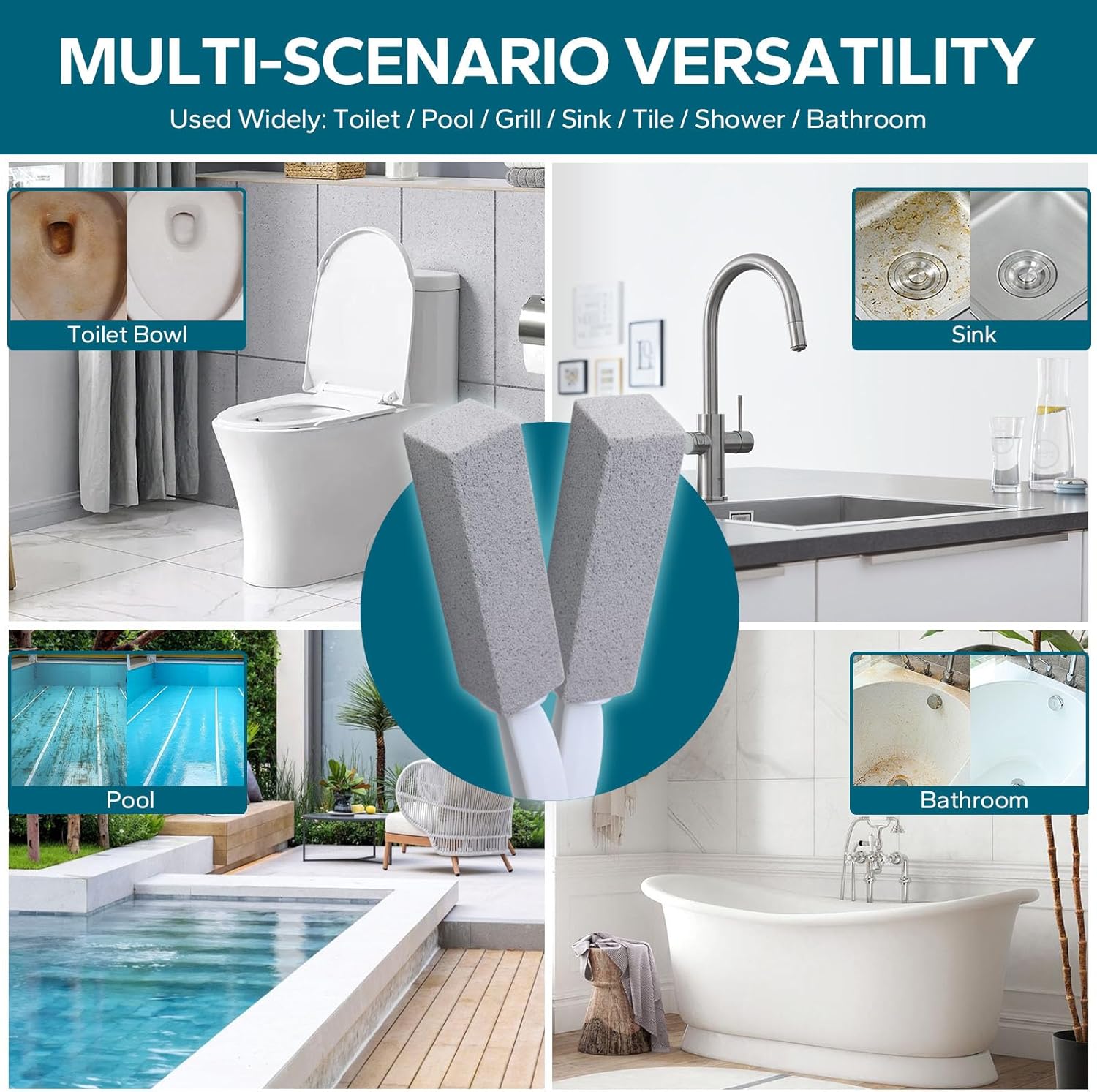 - Multi-scenario Versatility: The Pumice Stone Toilet Bowl Cleaner is a versatile tool for scrubbing, scraping, and cleaning. It can effectively remove calcium deposits, scale, and hard water rings from ceramic surfaces like toilets, sinks, and bathroom tiles. Additionally, it is also great for removing rust and grease from grills and ovens, as well as cleaning swimming pools. With the Pumice Stone with handle, stubborn stains in the kitchen, bathroom, and swimming pool can be easily eliminated.