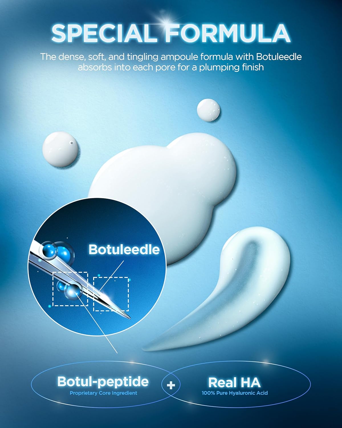 - BOTUL-PEPTIDE POWER — Features 50,000ppm ultra-low molecular hyaluronic acid, PDRN, Panthenol, and Squalane. This high-purity formula plumps skin, tightens pores, and delivers deep hydration for smoother texture.