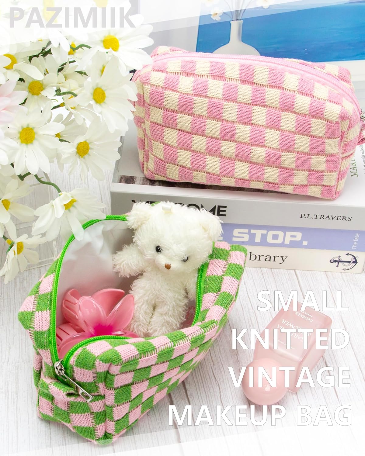 PAZIMIIK Checkered Makeup Bag for Purse Portable Zipper Make Up Pouch Small Cosmetic Case for Travel Accessories Pink Green