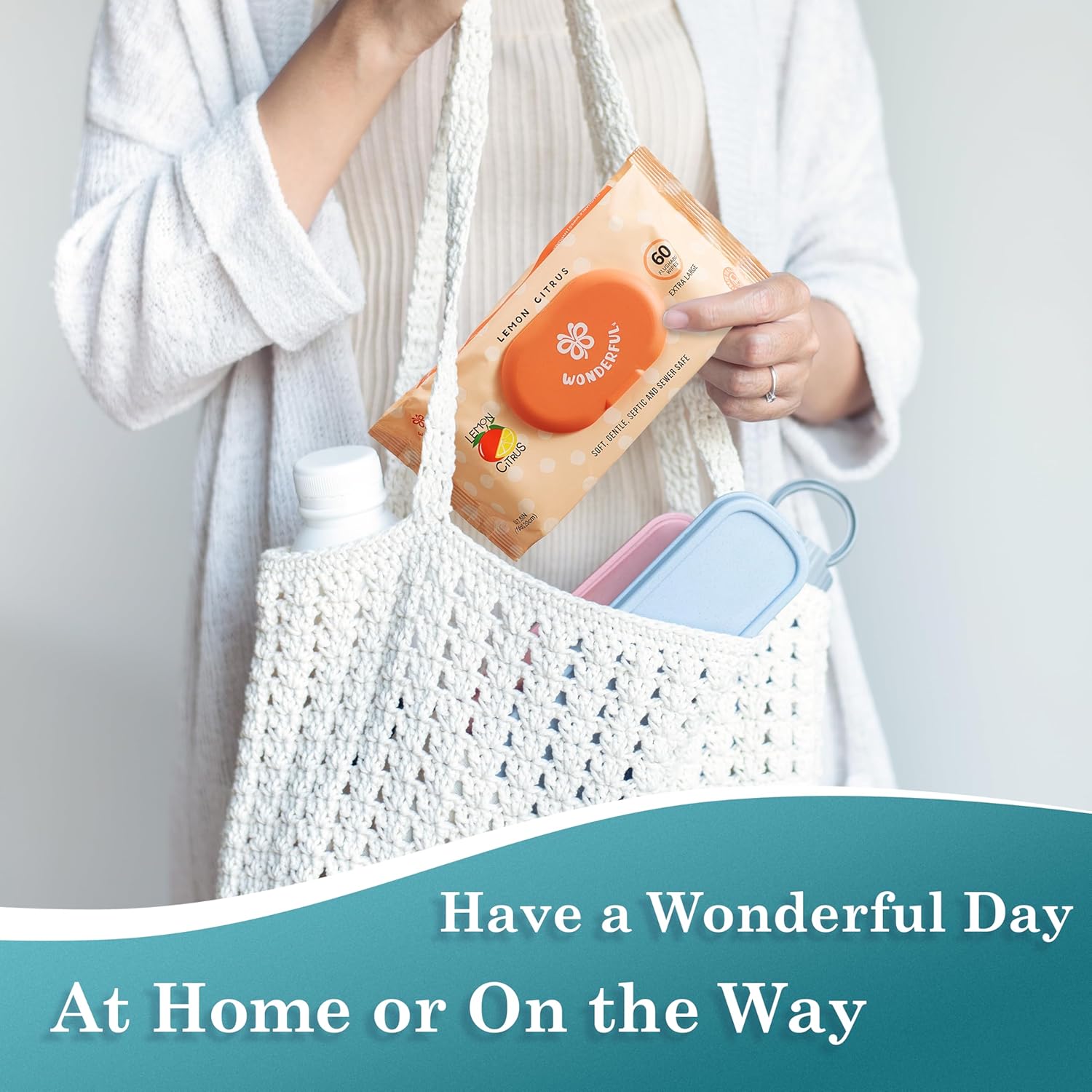 WONDERFUL Flushable Butt Wipes, Lemon Citrus 100% Plant-Based Wet Wipes for Adults & Kids; Sewer, Septic Safe; Gentle for Sensitive Skin, Wipes Flushable Pack for Bathroom & Travel, 3-Pack (180 Wipes)