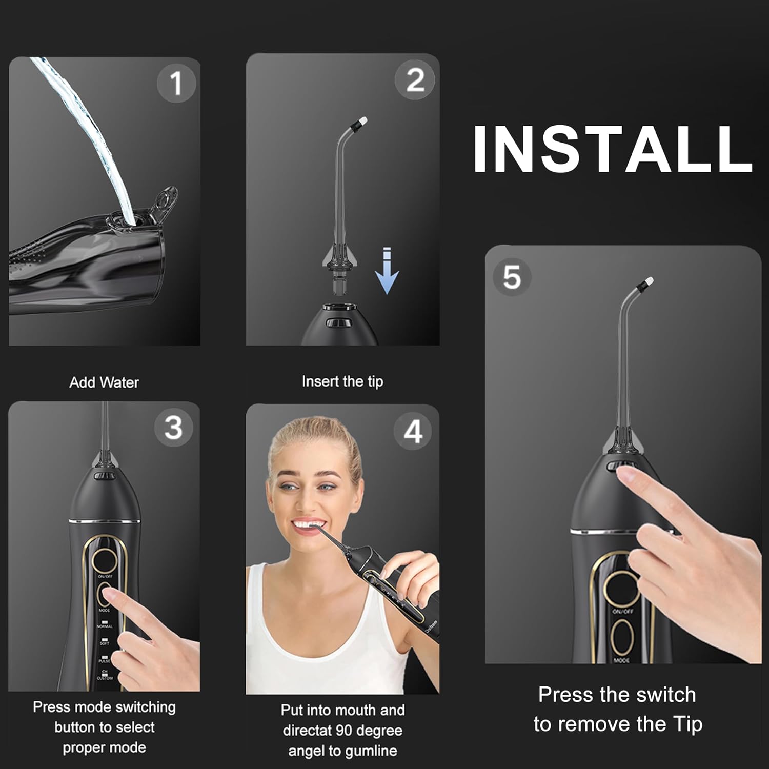 - 【How to Use】Press the nozzle replacement button on the top of the water flosser; Then carefully pull out the old nozzle and insert the new one into the nozzle slot.It is easy to install and replace.