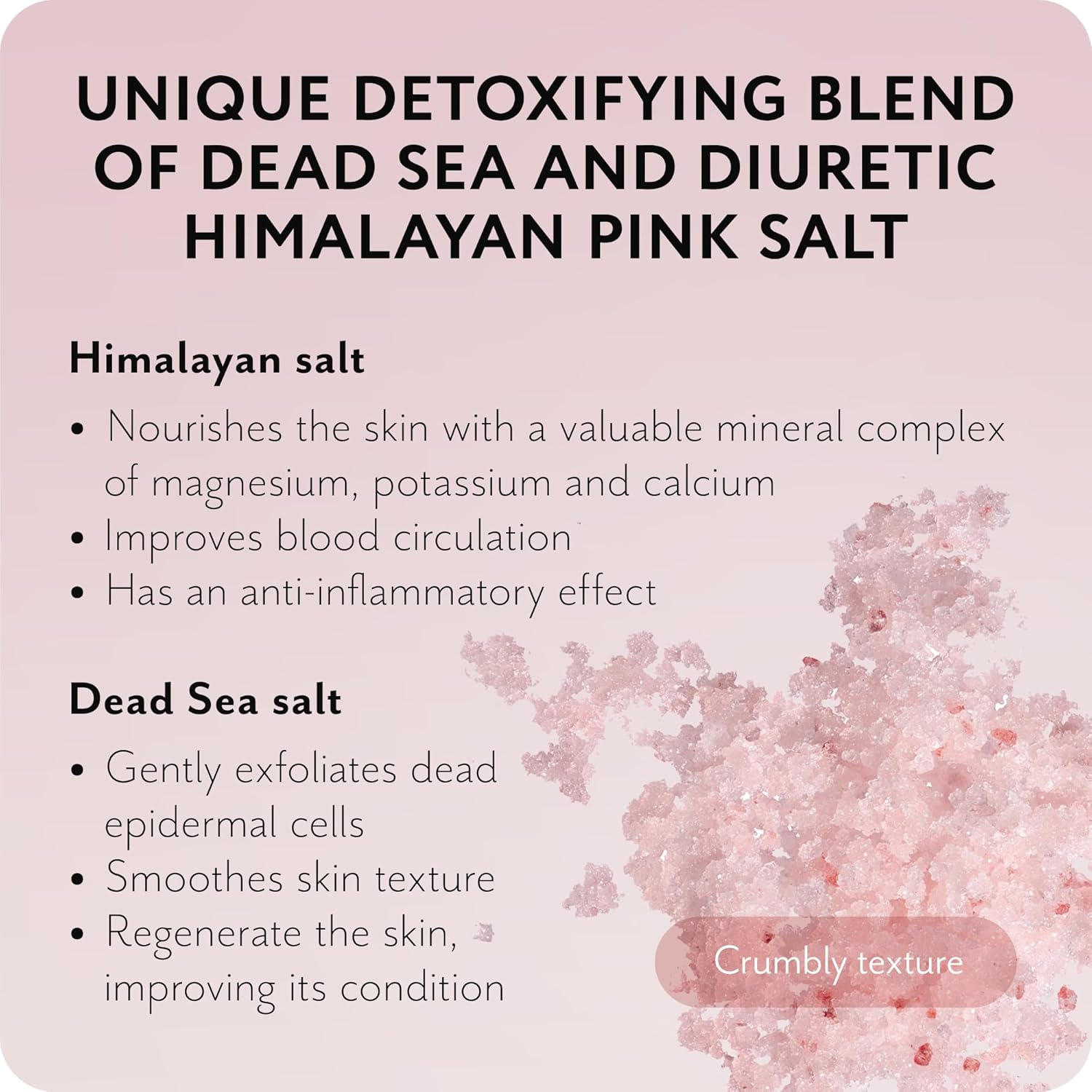 - ๐ฆ Effective Swelling Reduction and Drainage: The coarse salt texture helps remove excess fluid from tissues, which is especially important after physical activity. This effect reduces swelling and heaviness, making the exfoliating scrub an essential tool after long days or intense workouts.