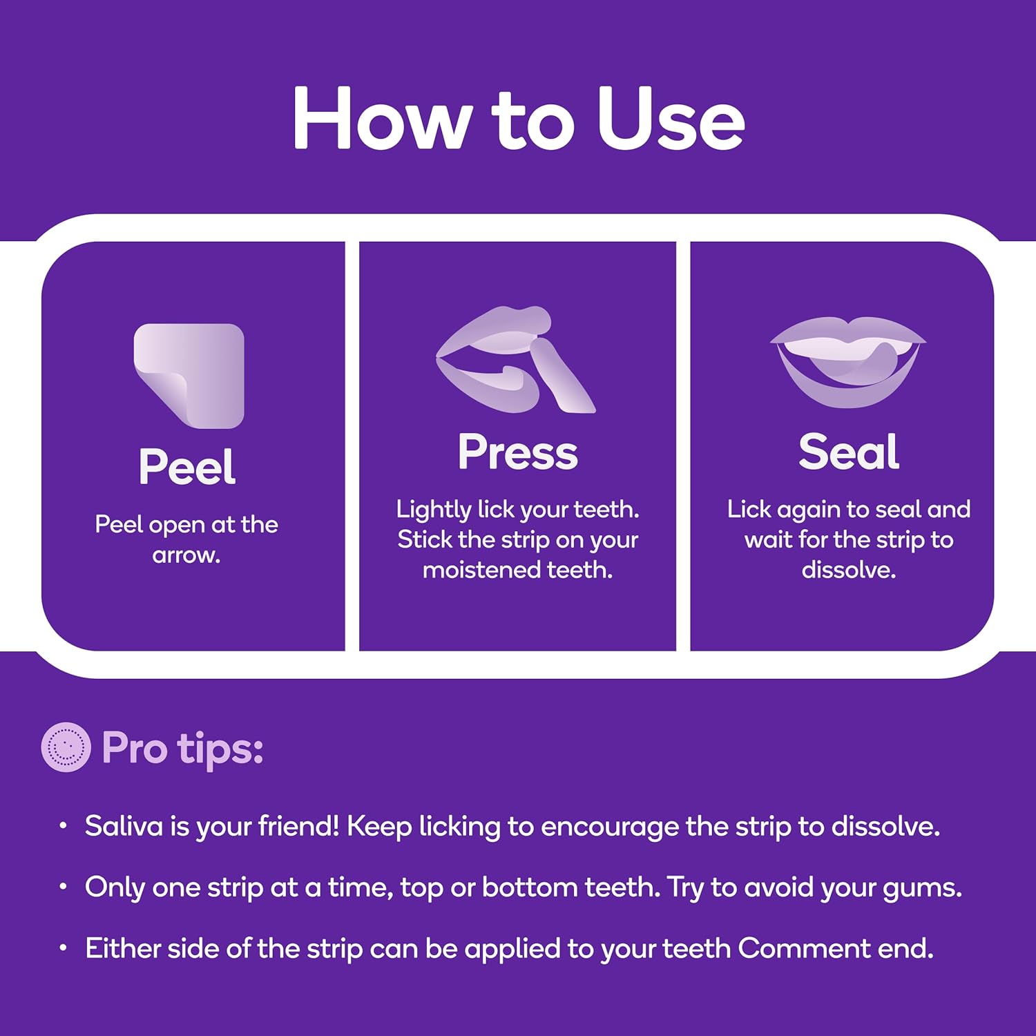 - π ππ¦π¦-ππ₯ππ / π€π¨πππ & πππ¦π¬ π§π’ π¨π¦π: Coffee on the go? Wine at happy hour? Simply apply a strip to your teeth (top or bottom), and let it dissolve to freshen your breath and remove surface stains.