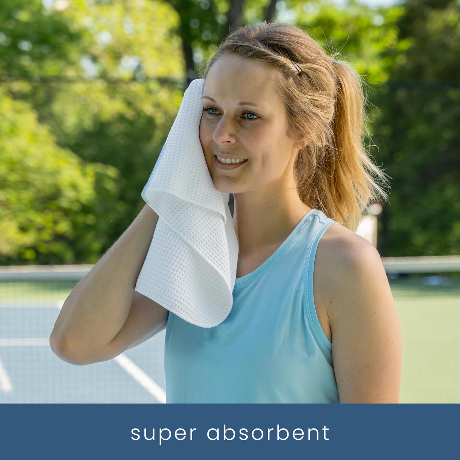 - One 3 pack of sweat towels for gym measuring 16 inches by 27 inches