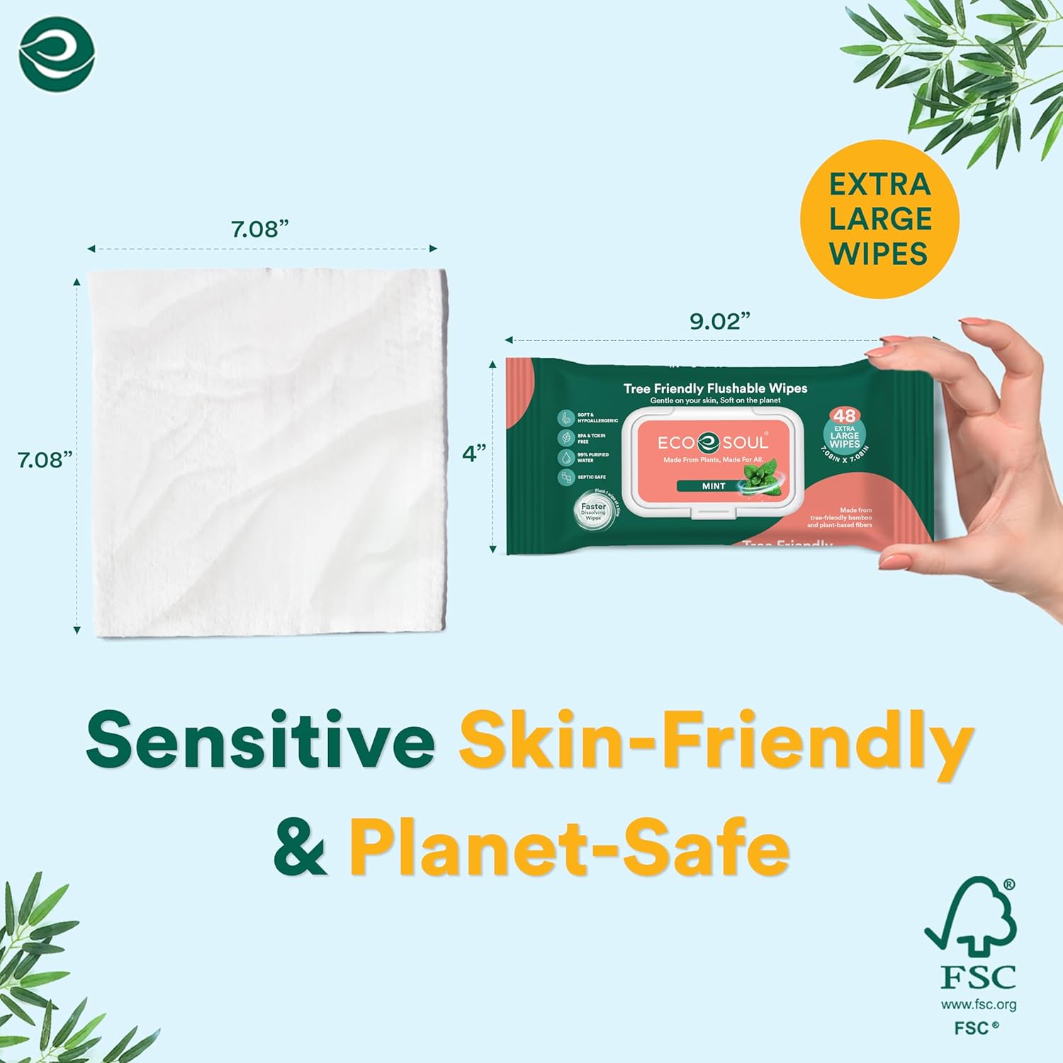 ECO SOUL Bamboo Flushable Wipes For Adult- Mint 192 Wipes |4 Pack of 48| Eco-Friendly Wipes| 99% Purified Water, Hypoallergenic, Soft Wipes, BPA & Paraben free