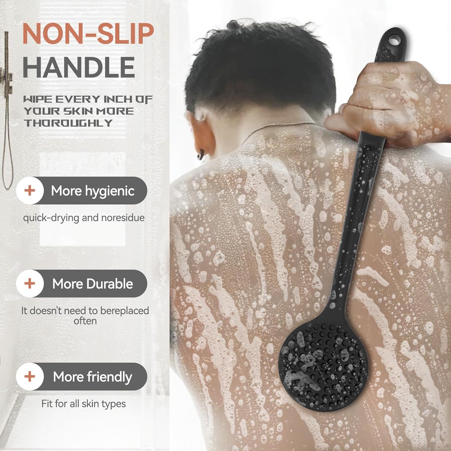- PORTABLE AND DURABLE: With a convenient hanging hole, our silicone bath scrubber is perfect for home or travel use. The soft silicone bristles and non-slip handle ensure durability and ease of use.