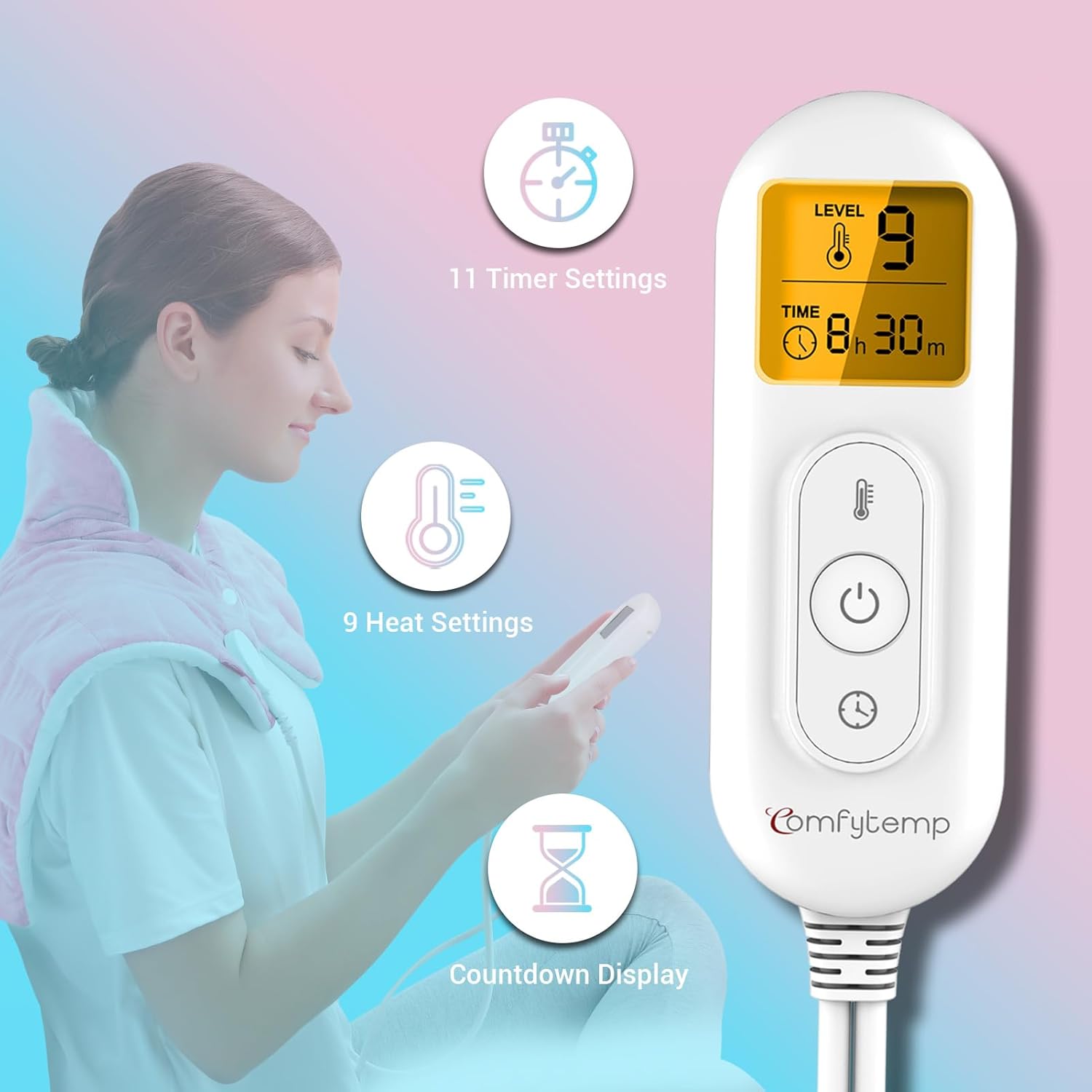 - 9 Heat Settings & 11 Auto-Off Timers: Offering 9 heat settings (temperature are 131 °F to 140 °F), which meet most pepole's hot compress need, and more safe. Furthermore, 11 auto-off timers (0.5H, 1H,1.5H, 2H, 3H, 4H, 5H, 6H, 7H, 8H, 9H), the neck heating pad allows you to customize the desired temperature and time for heat therapy. This helps conserve energy and prevents excessive heating. Heat pads make great anniversary, retirement, get well gifts for women.