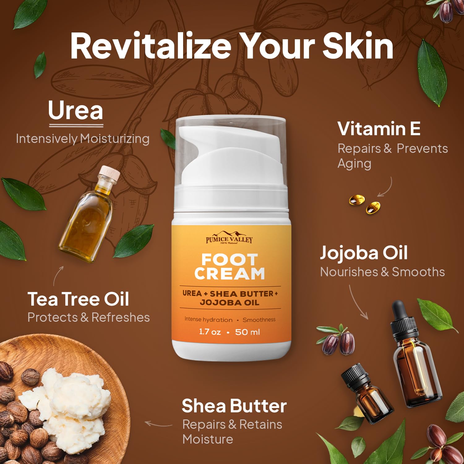 Pumice Valley Foot Cream for Dry Cracked Feet and Heels - Natural Moisturizer, Corn, Calluses Treatment - Skin, Body Lotion, Urea, Shea Butter, Jojoba Oil, Vitamin E 1.7 Oz