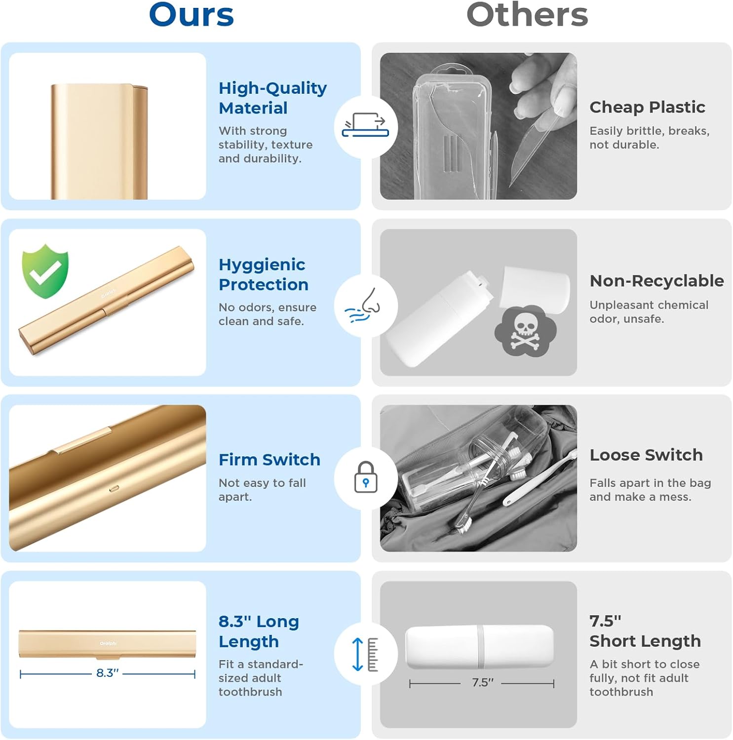 - High-Quality Material: Made of food-grade durable aluminum alloy, our travel toothbrush case is safe, non-toxic, odorless, and rust-free. Say goodbye to the common problem of the brittleness of plastic, as our toothbrush container stands the test of time with its robust build. Ensures your toothbrush stays clean and safe