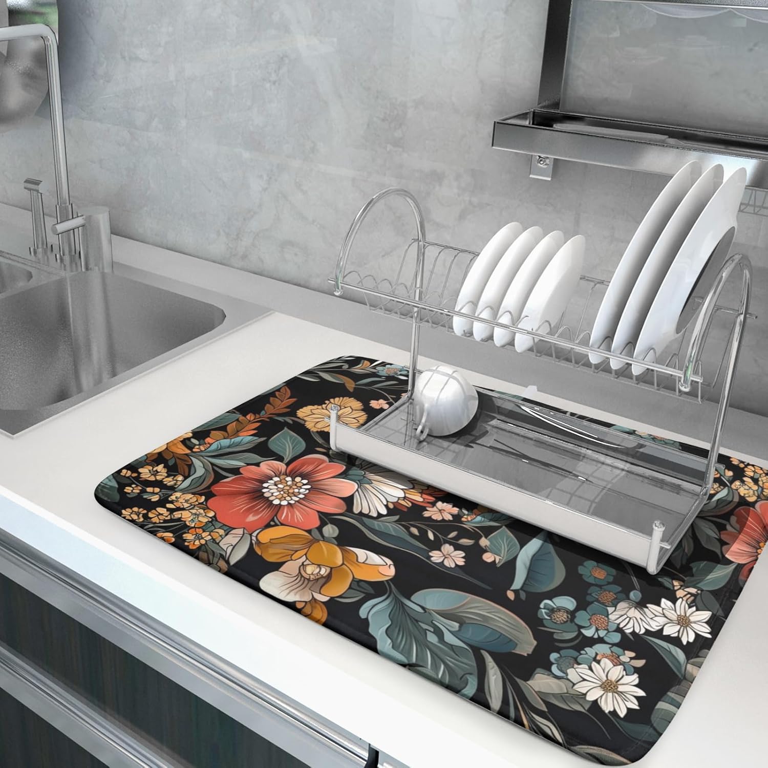 Vintage Floral Dish Drying Mat 18x24 inch Boho Flower Drainer Mats Fast Dry Absorbent Washable Dish Rack Pad Protector Kitchen Accessories