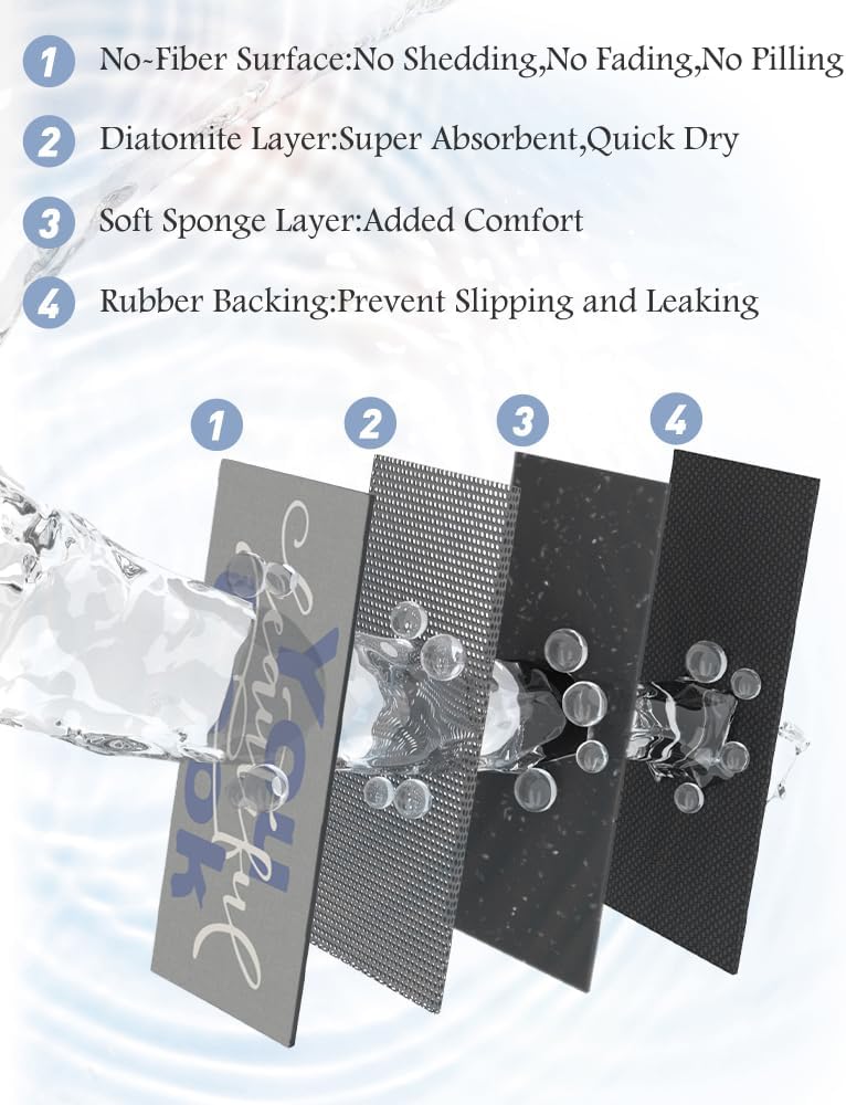 - Innovative Soft Diatomaceous Earth Bath Mat: Experience the perfect blend of comfort, functionality, and innovation with our luxury bath rug. Bathroom floor mat features a smooth leather-like surface for easy maintenance, a cushioning sponge layer for added comfort, a super absorbent and quick-drying soft diatomaceous earth layer, and a durable rubber backing for added stability.
