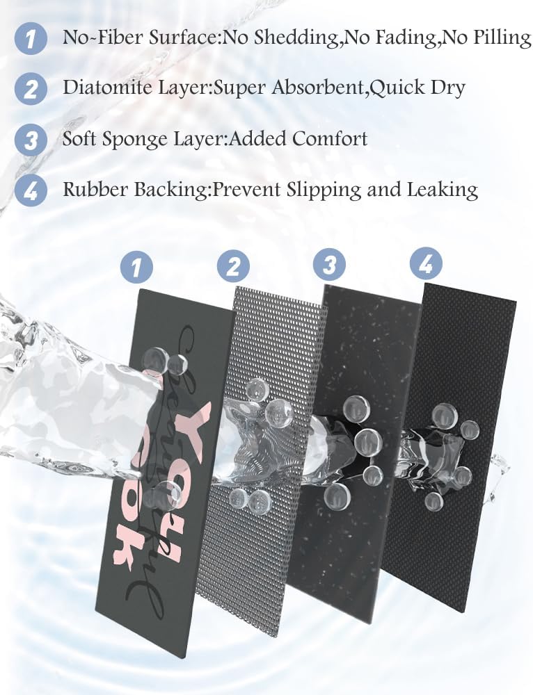 - Innovative Soft Diatomaceous Earth Bath Mat: Experience the perfect blend of comfort, functionality, and innovation with our luxury bath rug. Bathroom floor mat features a smooth leather-like surface for easy maintenance, a cushioning sponge layer for added comfort, a super absorbent and quick-drying soft diatomaceous earth layer, and a durable rubber backing for added stability.