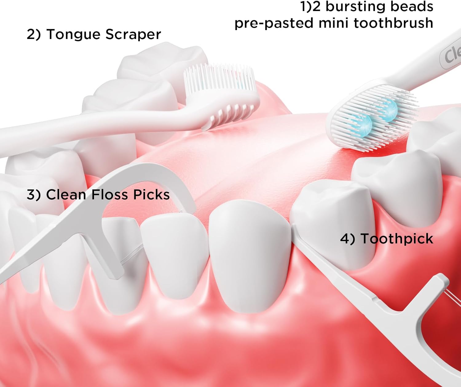 - Pre-Pasted Mini Toothbrush: Each disposable mini toothbrush comes with built-in dual burst beads—no extra tubes needed! Enjoy instant freshness with BPA-free, fluoride-free toothbrush bristles and a refreshing mint burst. Perfect for on-the-go cleanups, travel, or after meals!