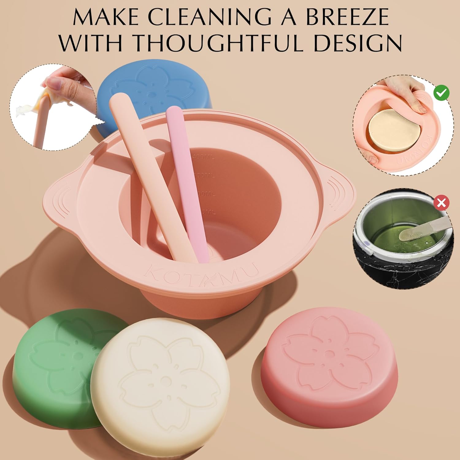- Effortless Cleanup Design: Our hard waxing kit features a non-stick silicone pot and spatulas, simplifying your post-wax cleanup. The silicone material prevents wax from adhering to the pot, allowing easy wax removal and ensuring your equipment stays pristine. This feature is a game-changer for those who dread the post-wax cleanup, turning a chore into a trivial task.
