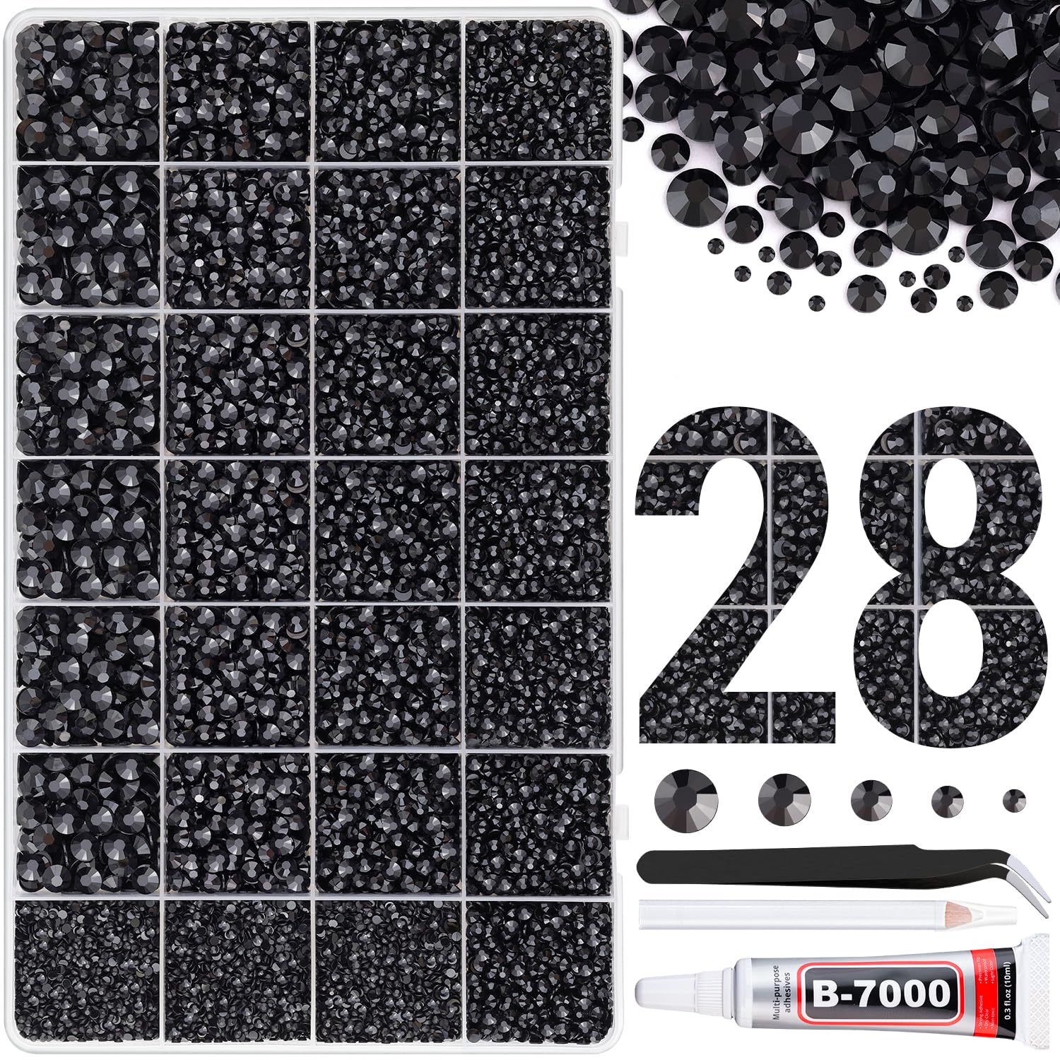 - PACKAGE CONTENT -- Include 1 box with 28 grids, featuring a variety of sizes, approx. 30000 pcs bling-out resin rhinestones. 1 tweezers and 1 pickup pen are included for easily picking up gems. 1 B7000 adhesive jewels glue for jewelry making