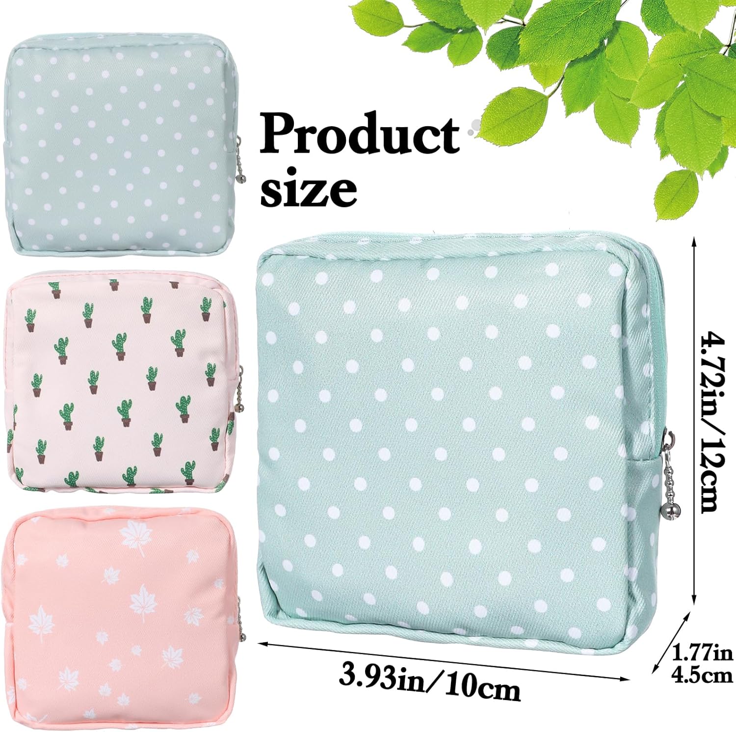 - Cute Appearance: This women's sanitary napkin storage set is designed with three different styles of menstrual bags to meet the aesthetic preferences of different women. The pink maple leaf style, cactus style, and green polka dot style are simple and stylish. This period bag set is not only practical, but also a good helper for women's menstrual period.
