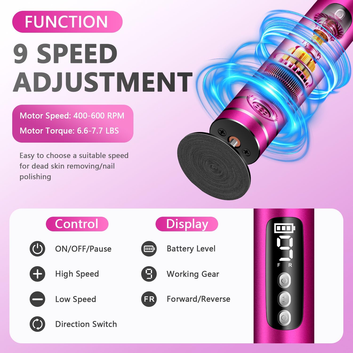 - ✅ 9 Adjustable Speeds (400-600 RPM) – There are 9 optional gears customize intensity from gentle to professional-grade, suitable for beginners & pros. Deep & Gentle Exfoliation, High-speed rotating heads effortlessly remove hard skin & calluses without irritation, leaving feet soft & smooth