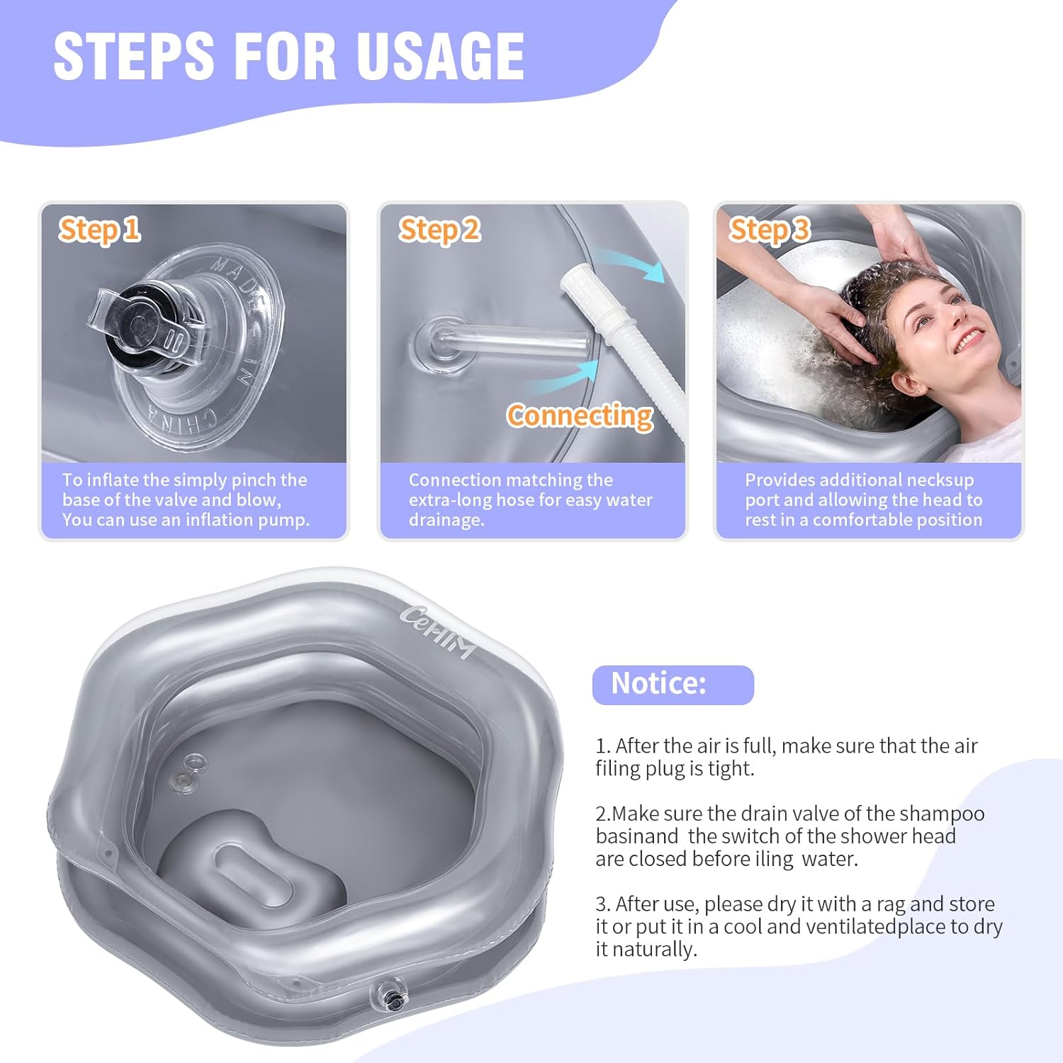 - Lightweight & Versatile Use:At just 1.1 lbs, this inflatable hair basin sets up in 3 minutes (blow up by mouth or pump). Use it on beds, couches, wheelchairs, or even camping trips—no need for a bathroom. The anti-slip base stays put, so you can focus on washing, not chasing spills.(This set does not include an inflation pump.)