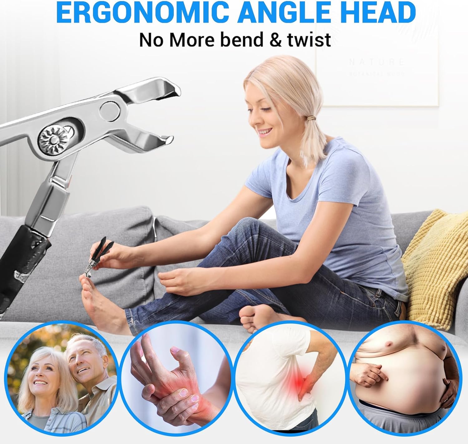 - ERGONOMIC ANGLED NAIL CLIPPERS: Designed with a 7-shaped angled head, the thick nail clippers with catcher offer a clear view for safe, precise trimming—no bending or twisting needed. Perfect for seniors or users with limited mobility. With a 5× wider jaw and 3.8-inch non-slip handle, these long handled nail clippers cut thick, hard toenails easily while offering extra leverage and control
