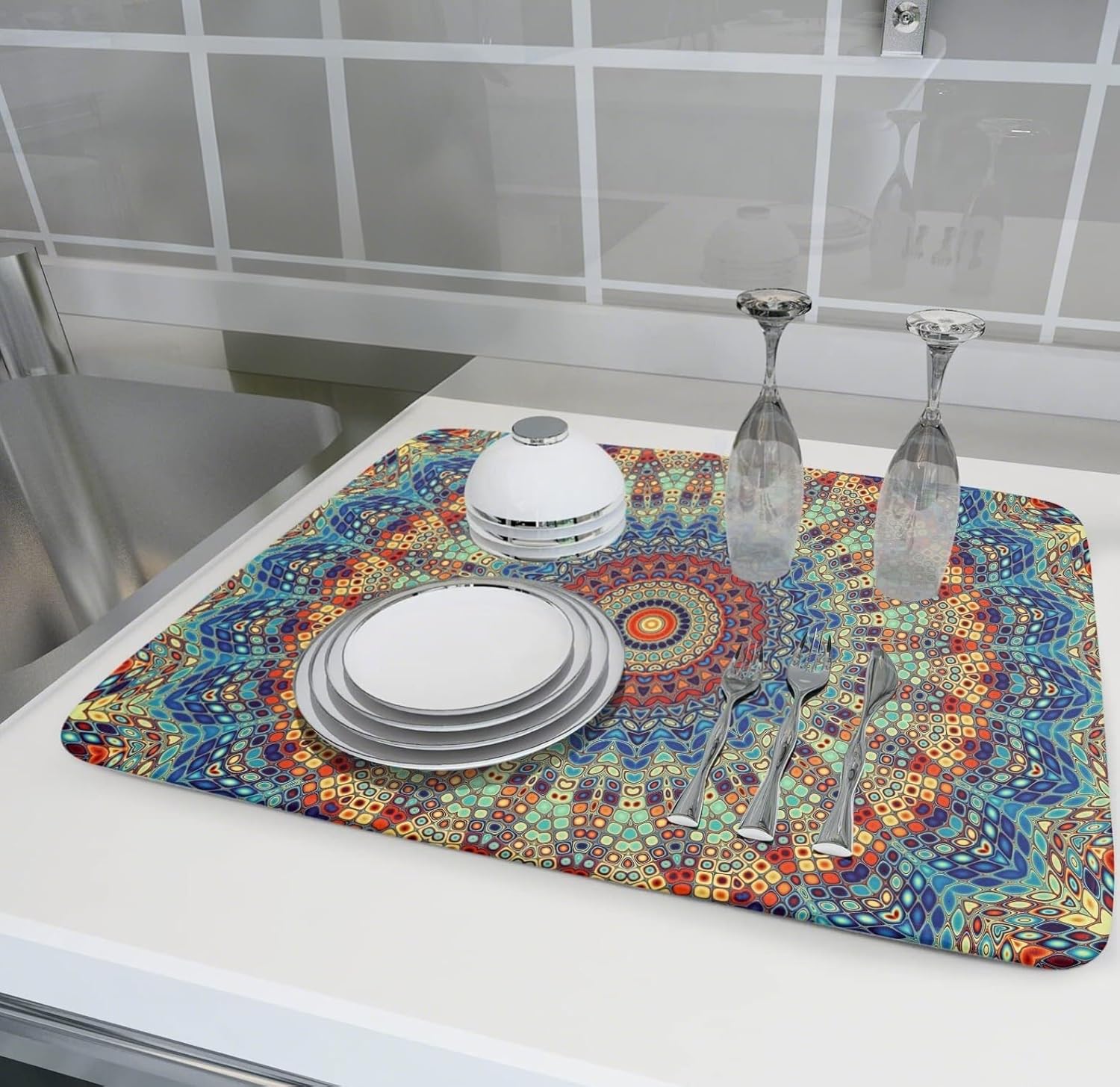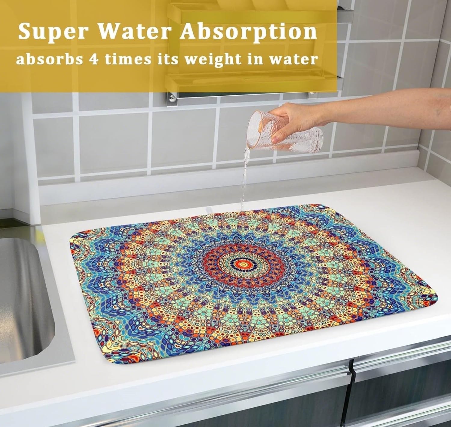 Bohemian Mandala Dish Drying Mat for Kitchen Counter Boho Microfiber Dish Drying Mats 18 x 24 Inch with High Absorbent Reversible Microfiber Dish Drying Pad Rack Mat for Coffee Bar