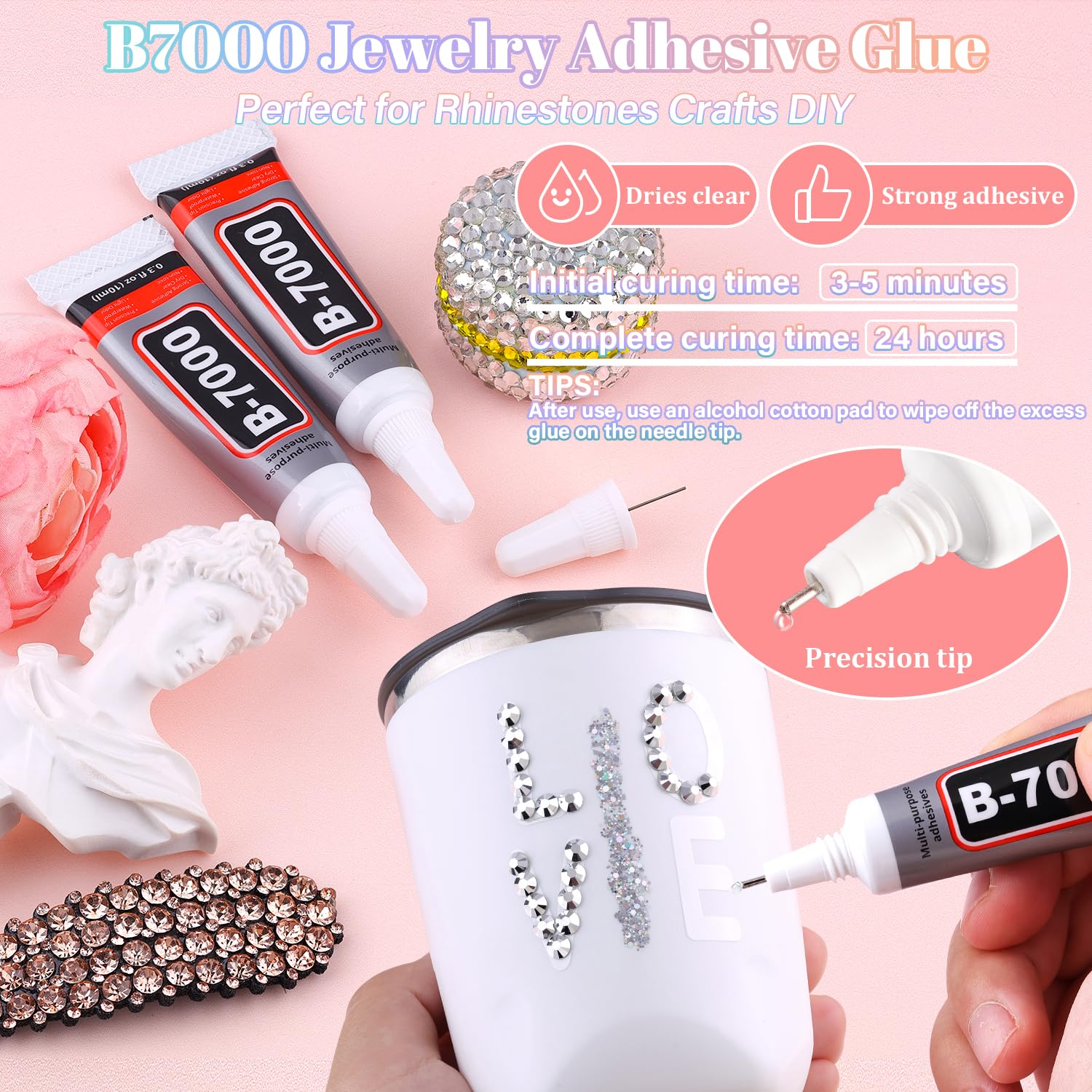 - STRONG B7000 GLUE FOR GEMS – B7000 glue offers strong, long-lasting adhesion and dries clear, making it perfect for securing gemstones and other embellishments. The precision needle tip allows for controlled, mess-free application. For best results, clean the needle with an alcohol wipe after each use to prevent clogging and ensure smooth flow every time.