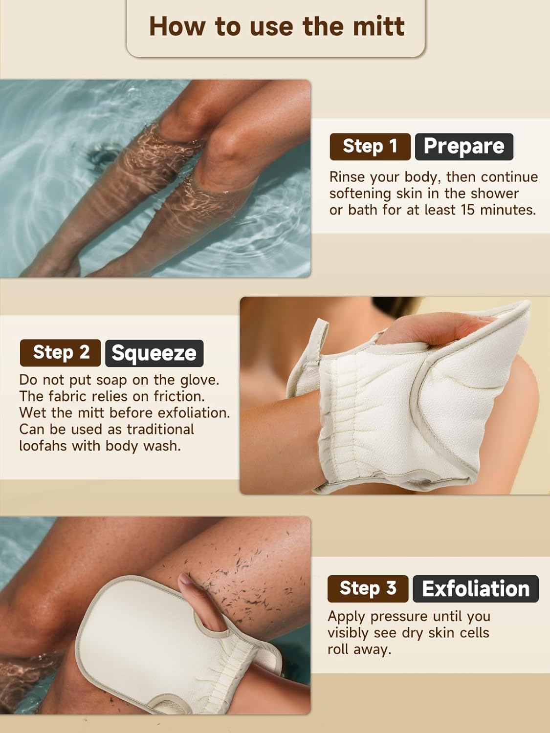 • 100% Chemical-Free Korean Exfoliating Mitt: Uses water only to rejuvenate and exfoliate skin with this effective dead skin remover exfoliating mitts. leaving your skin smooth, radiant, and ready for other personal care products. Our exfoliating gloves for shower is better than loofahs or chemical exfoliants