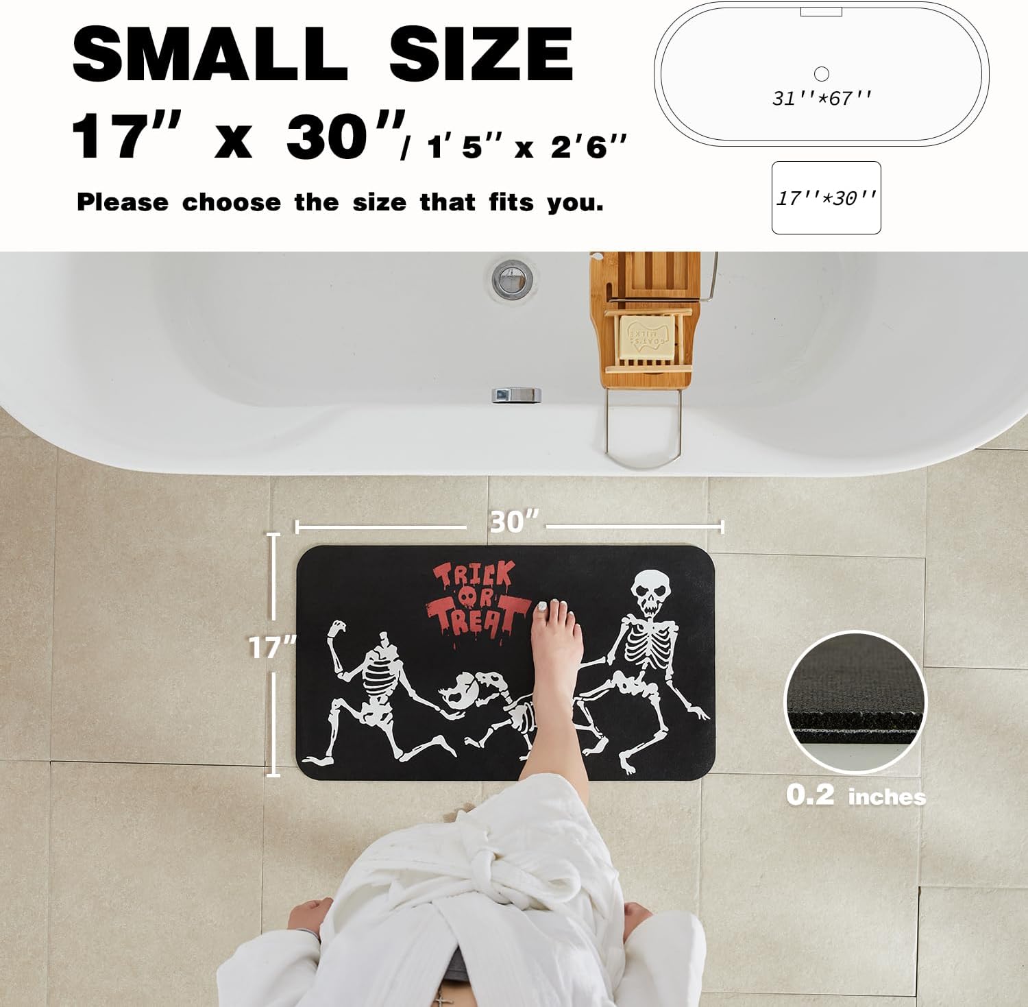 - Halloween Decor: TYUU halloween bath mat design is feasturing various Halloween elements-pumpkins, cute spooky ghost, bats and skeleton. Bringing the spooky and charming atmosphere of the holiday into your bathroom