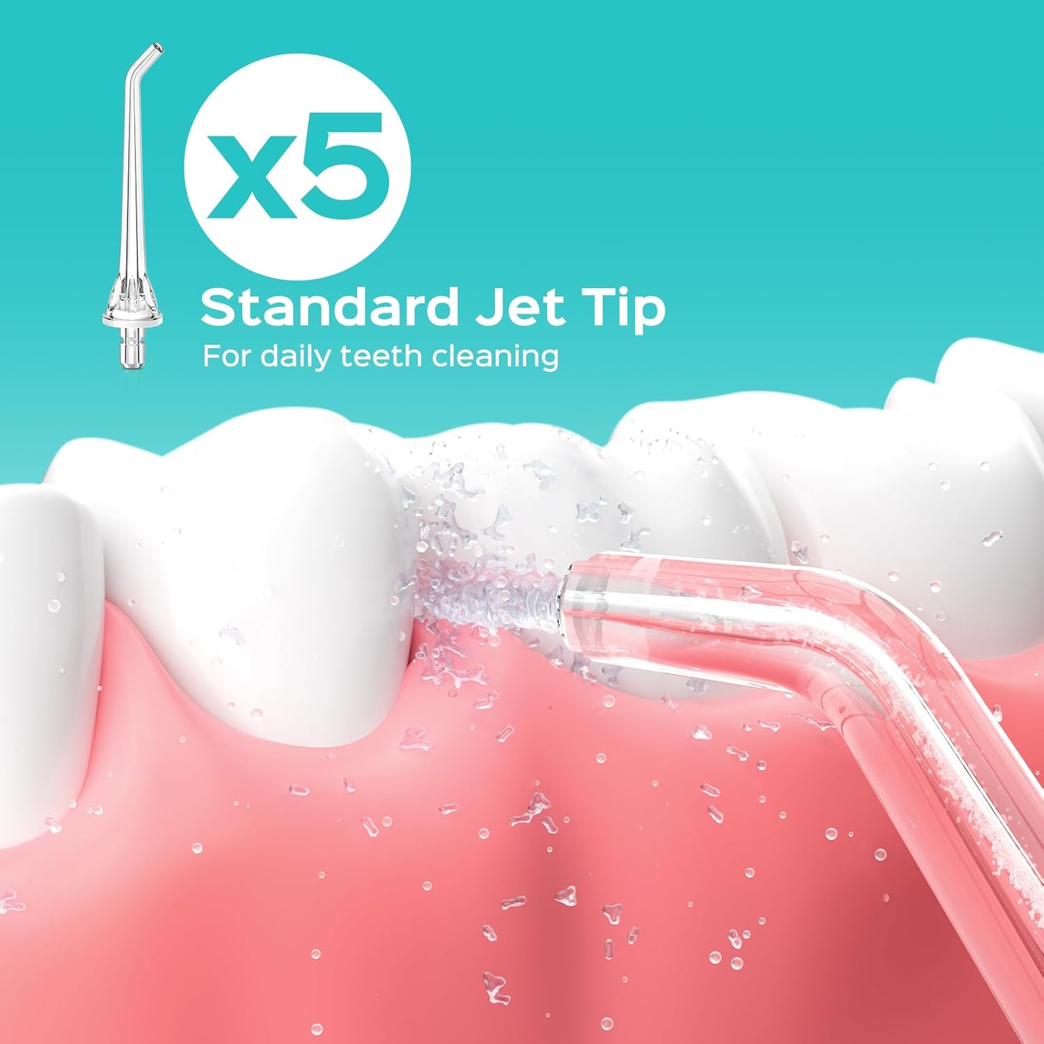 - Multi-Pack for the Whole Family: Choose appropriate tips based on different oral conditions. This set includes multiple tips to cater to everyone's needs. It is recommended to replace the tips every three months. (Standard jet tip for daily teeth cleaning, periodontal tip for gentle gum care, orthodontic tip for cleaning braces, bridges, and residual material, tongue cleaner tip for effective coating and residual removal.)
