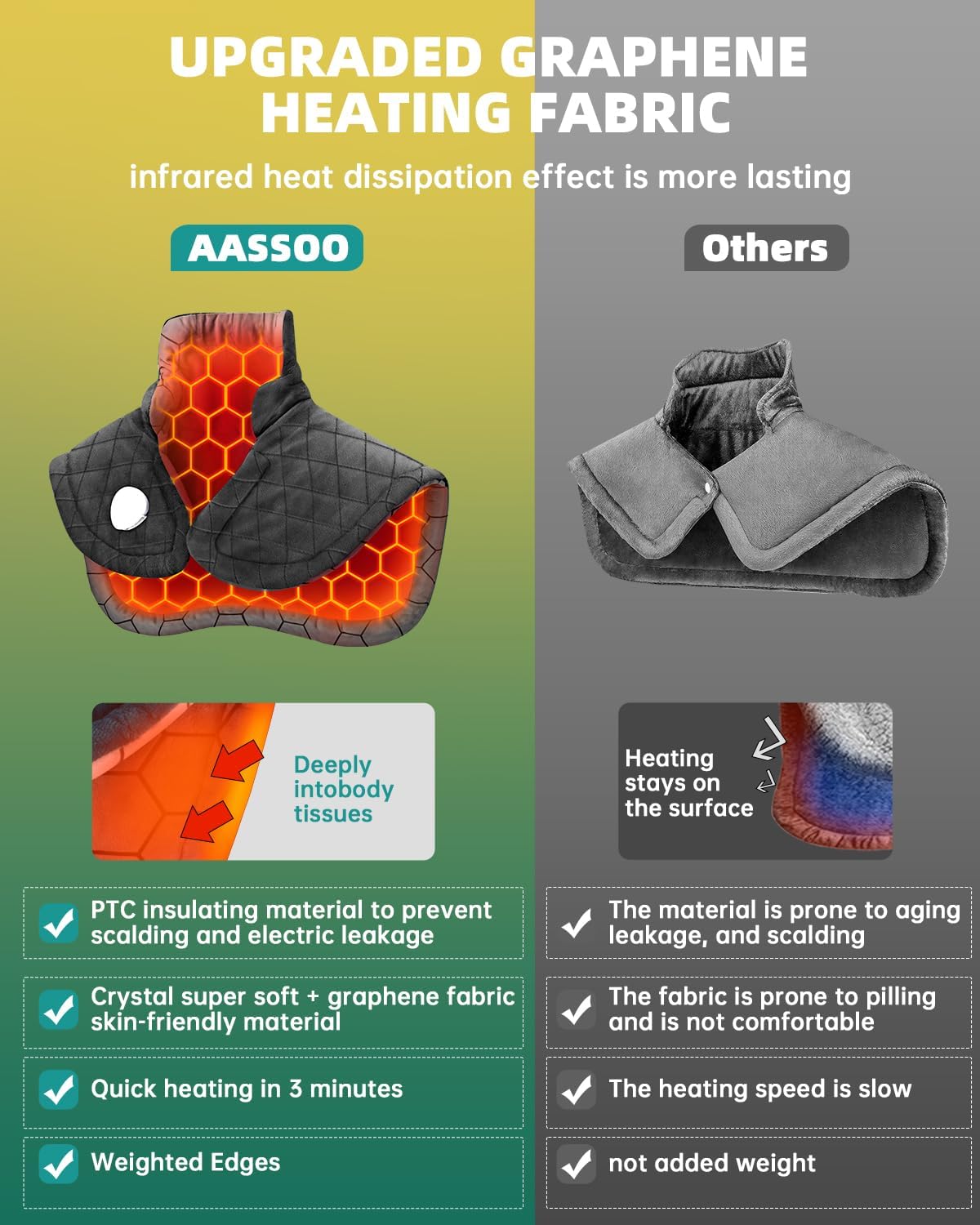 - Upgraded Deep Penetrating Heat Therapy - Our graphene-infused heating pad delivers far-infrared heat that penetrates 3X deeper than ordinary pads, effectively relieving muscle tension, arthritis pain, and stiffness in neck, shoulders, and back.Constant temperature energy-gathering heating sheet, longer-lasting warmth.