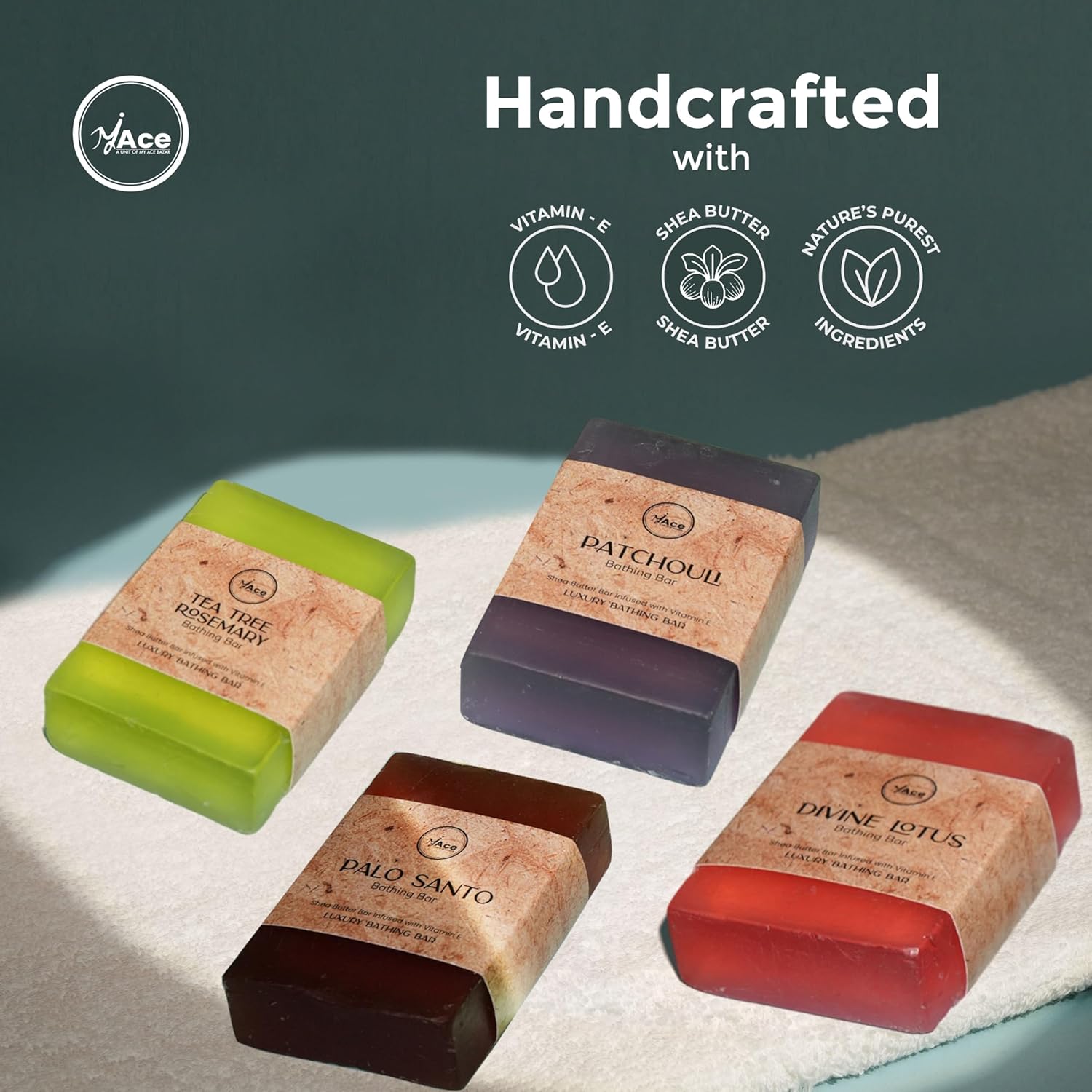 MY ACE Handmade Soap Set – 4 Bathing Bars: Tea Tree Rosemary, Patchouli, Divine Lotus & Palo Santo – SLES & Paraben-Free, Coconut Oil, Shea Butter & Vitamin E – Gentle & Moisturizing, 3.5 oz Each