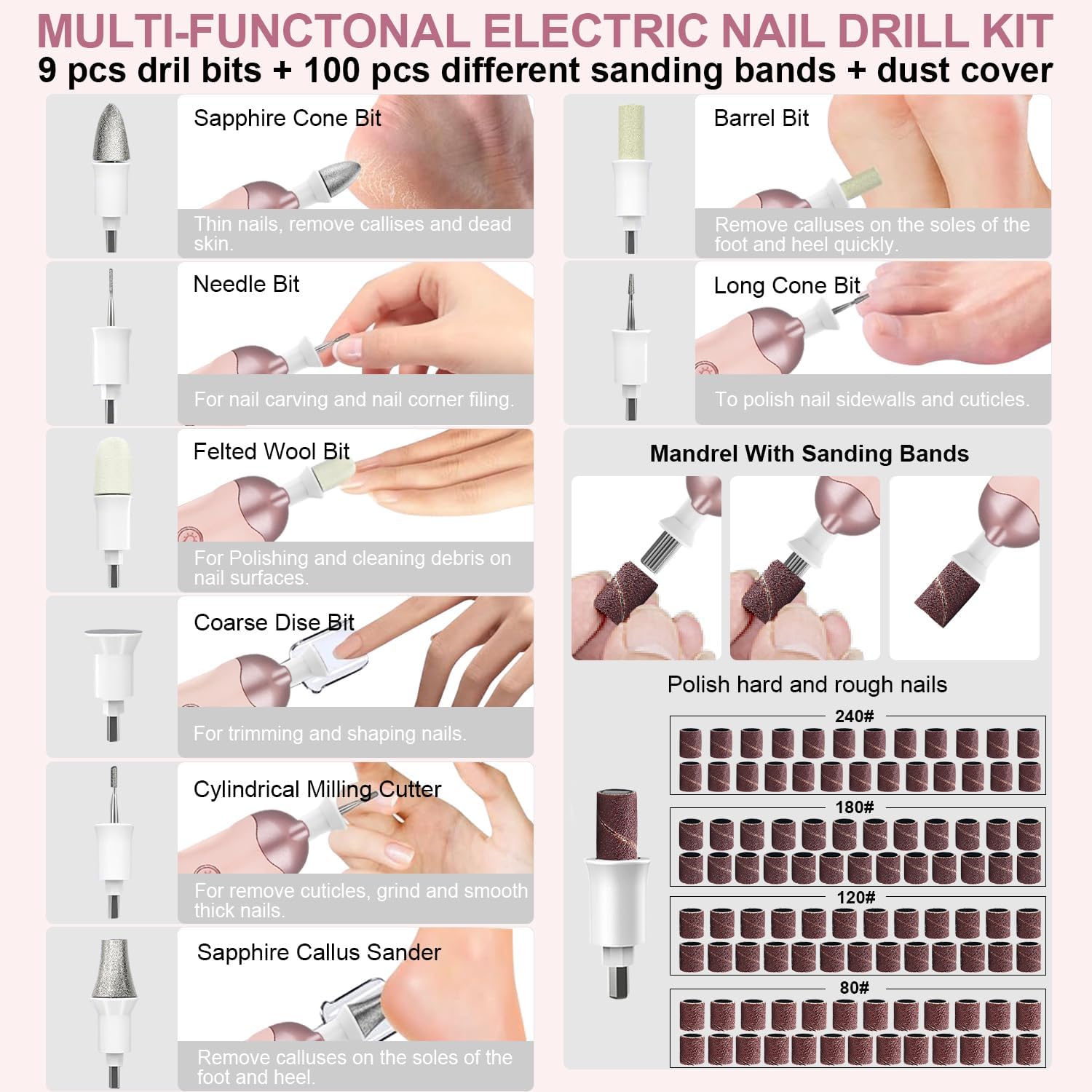 2 Pack 9-in-1 Cordless Nail Drill Nail Care with 100 Bits, 5 Speeds, Home & Salon Ready,Pink