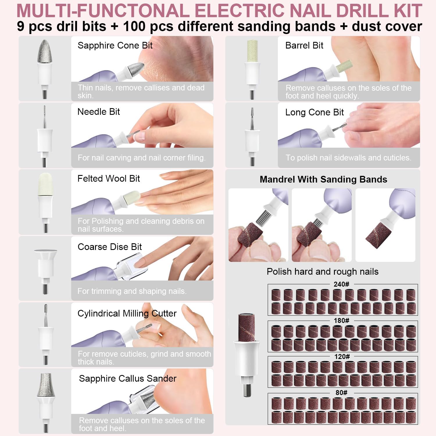 4 Pack Professional 9-in-1 Nail Drill Kit, Electric Nail File, Cordless 5 Speeds for Effortless Nails Care,Purple