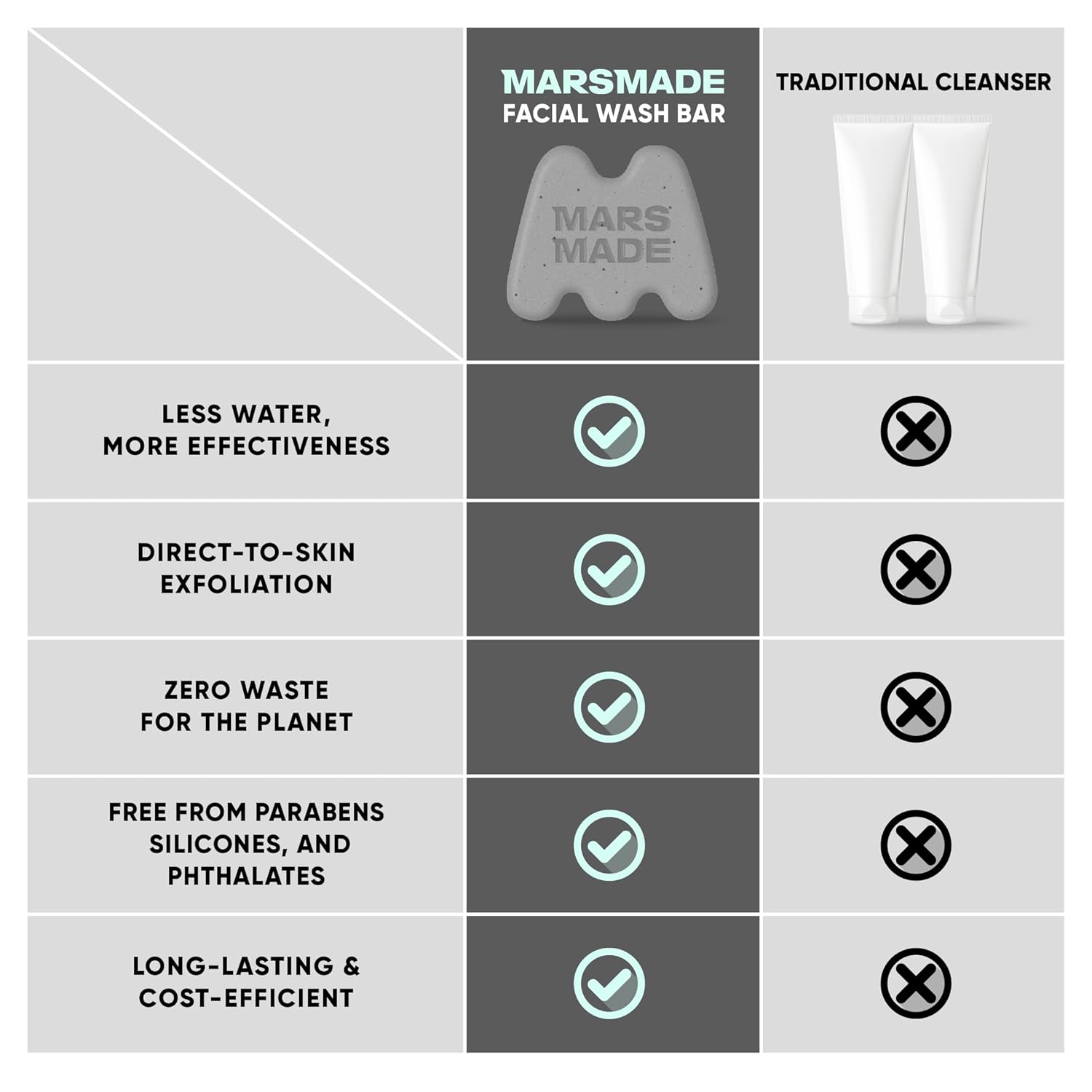 - PLEDGE TO QUALITY. We love hearing how much customers appreciate the effectiveness of MARSMADE Face Shower, Bar Soap! Our tube-free facial bars deliver a gentle cleanse and last as long as 2 tubes of liquid cleanser. MARSMADE proudly supports adults with special needs through the production and packaging of every product.