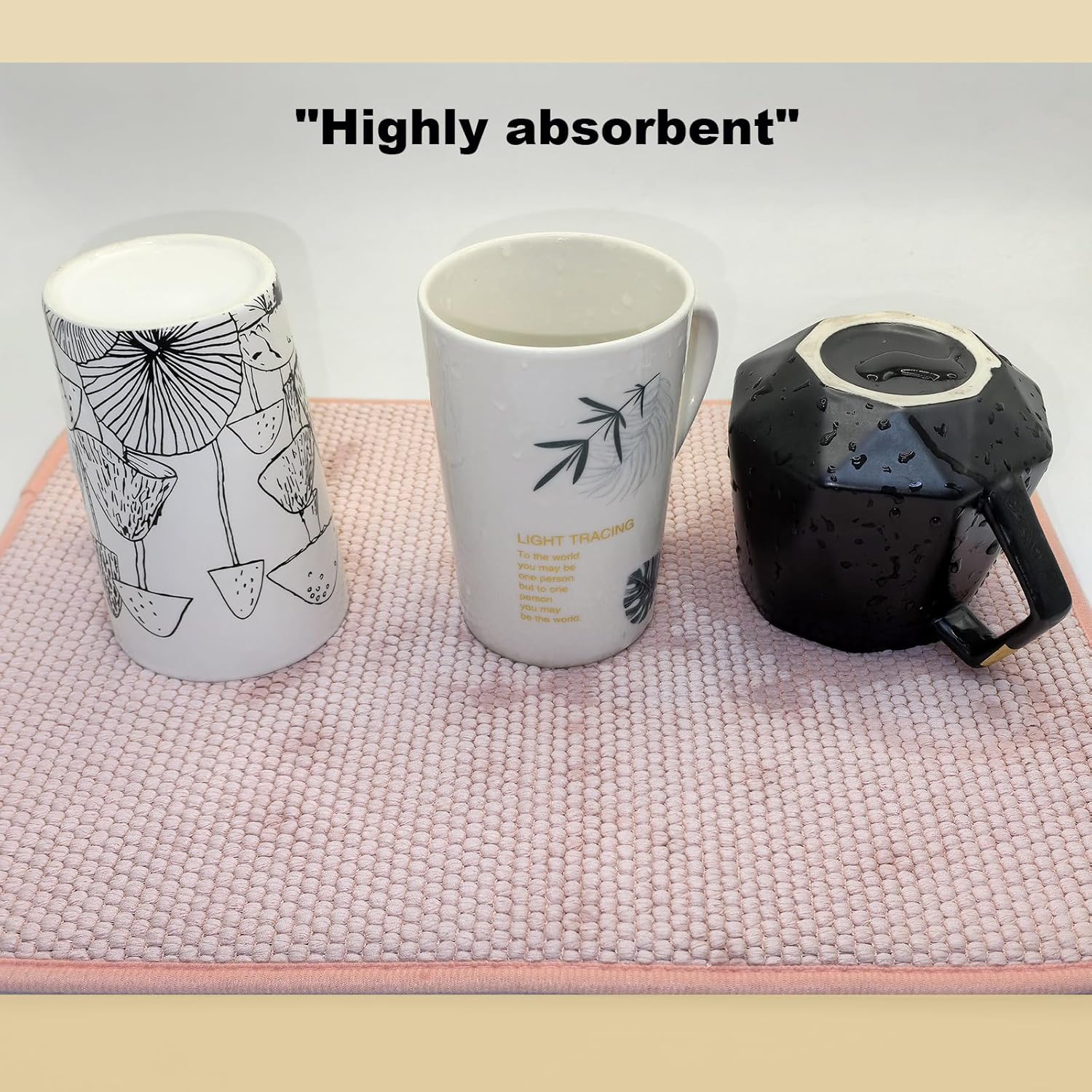 - 【Super Water Absorption】The pink kitchen mats are made of microfiber. Absorbs up to 4 times its own weight in water to keep kitchen counter tops dry. Our 20*15 Inch large size countertop drying pad can hold more utensils. And it quickly absorbs water droplets under bowls, plate racks, cutlery, cups.
